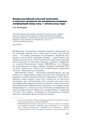 Статья: ТРЕНДЫ РОССИЙСКОЙ СЕЛЬСКОЙ ЭКОНОМИКИ И СЕЛЬСКОГО РАЗВИТИЯ (ПО МАТЕРИАЛАМ АГРАРНЫХ КОНФЕРЕНЦИЙ КОНЦА 2024 - НАЧАЛА 2025 ГОДА) (2025)