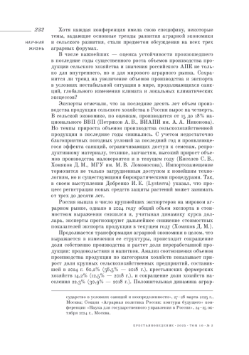 Конференции, посвященные аграрной тематике, традиционно носят сезонный характер, как и сама отрасль: весна, лето, ранняя осень — это период проведения исследований и обработки материалов, а затем ученые «оценивают урожай» — представляют и обсуждают их результаты. В настоящей статье представлен краткий обзор дискуссий на некоторых недавних аграрных конференциях, а именно Никоновских чтениях (ВИАПИ им. А. А. Никонова), Емельяновских чтениях (кафедра Аграрной экономики МГУ им. М. В. Ломоносова), «Наука для государственного управления в России» (Президентская академия)