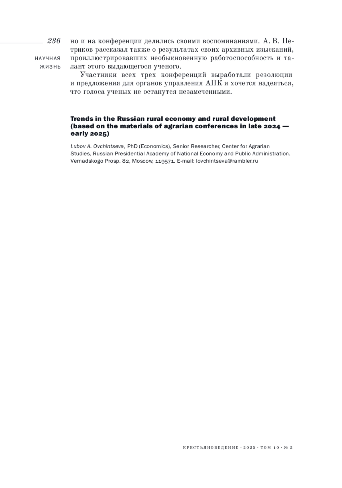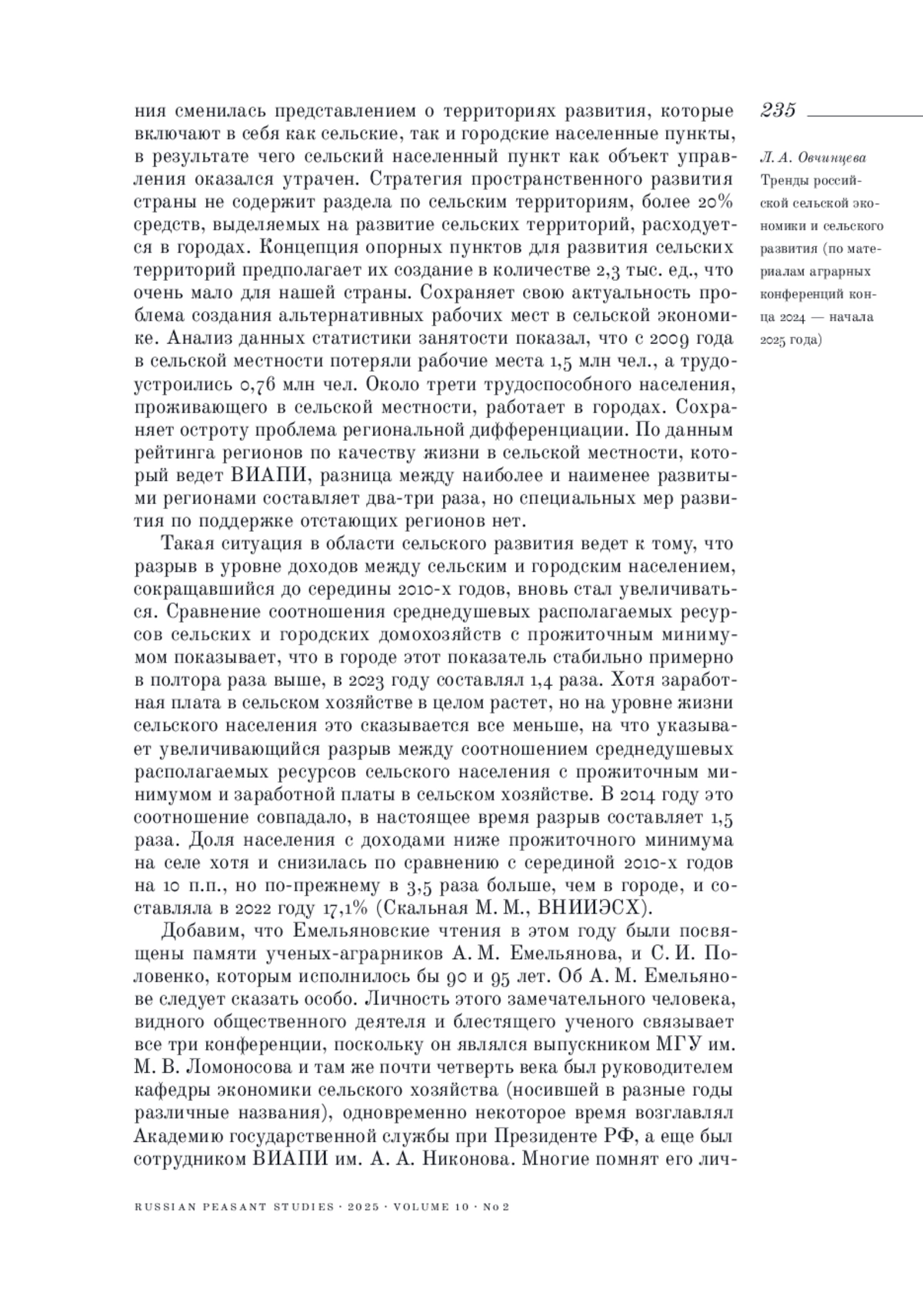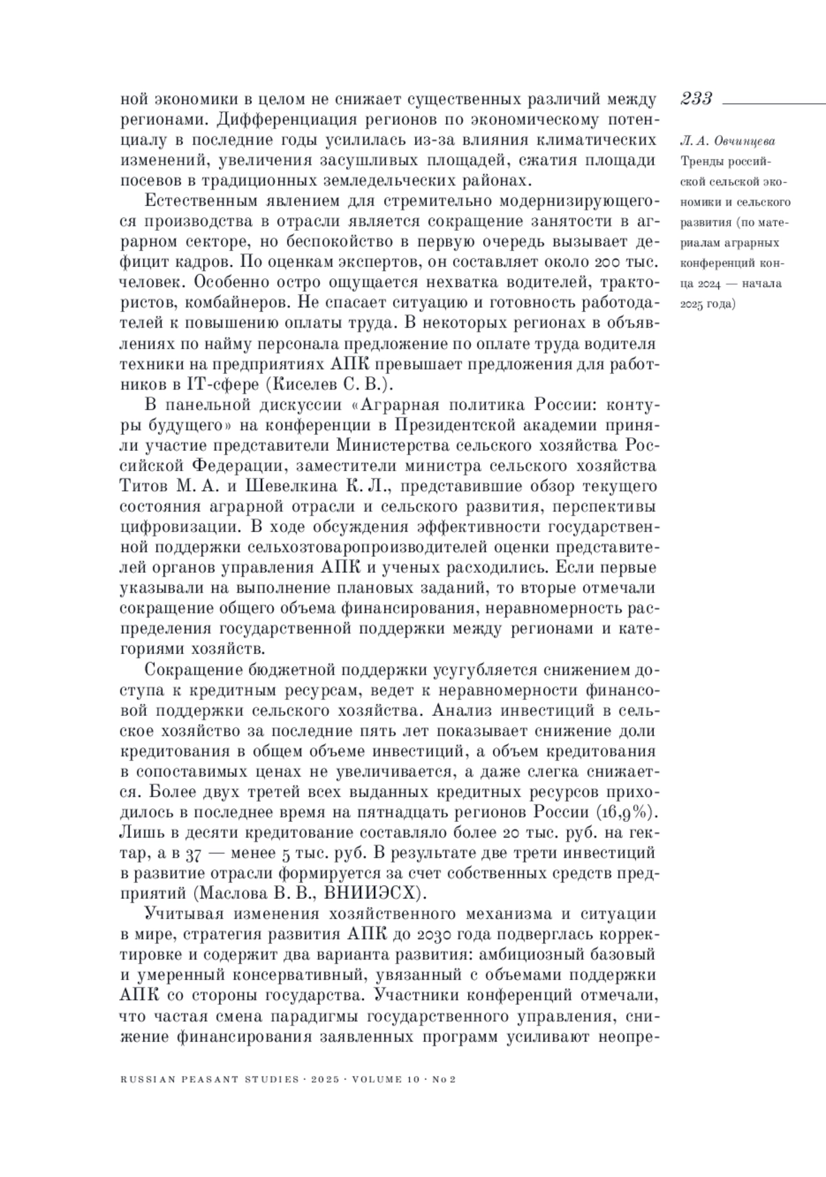 ОВЧИНЦЕВА Л. А. ТРЕНДЫ РОССИЙСКОЙ СЕЛЬСКОЙ ЭКОНОМИКИ И СЕЛЬСКОГО РАЗВИТИЯ (ПО МАТЕРИАЛАМ АГРАРНЫХ КОНФЕРЕНЦИЙ КОНЦА 2024 - НАЧАЛА 2025 ГОДА) // КРЕСТЬЯНОВЕДЕНИЕ. 2025. Т. 10 № 2