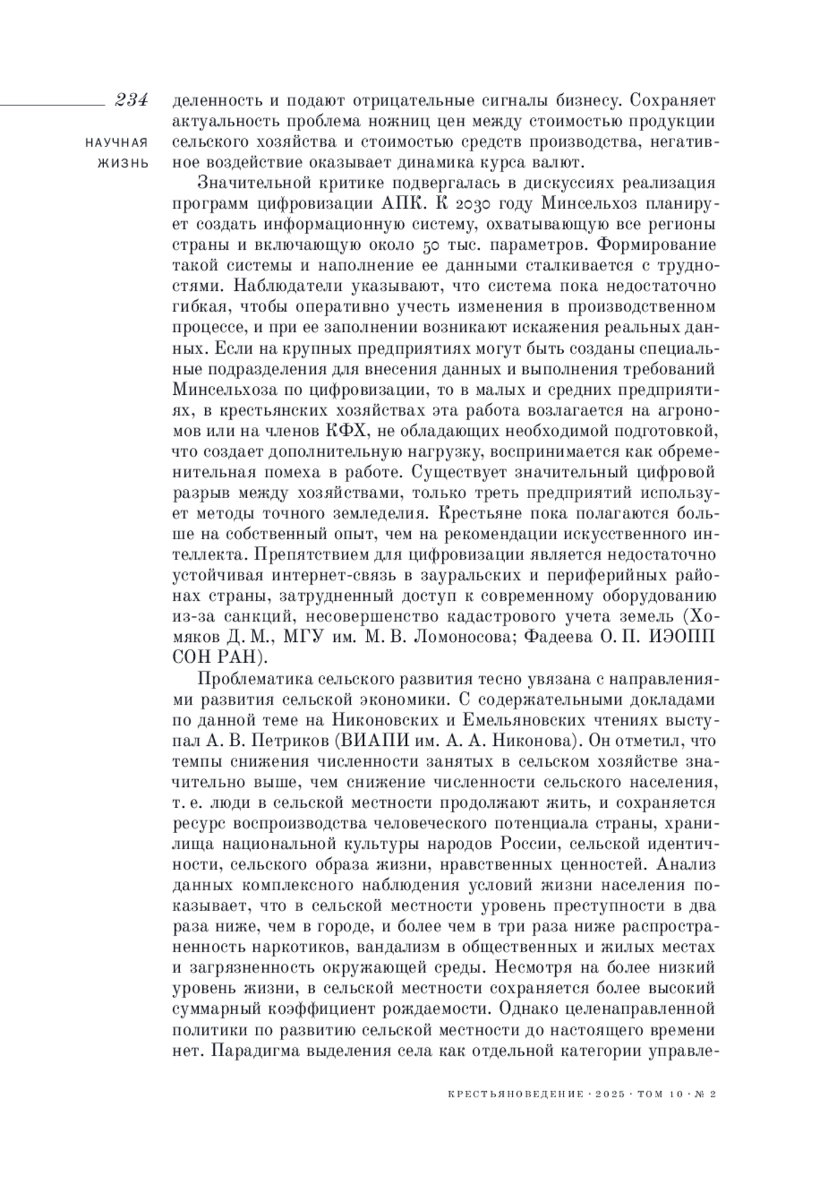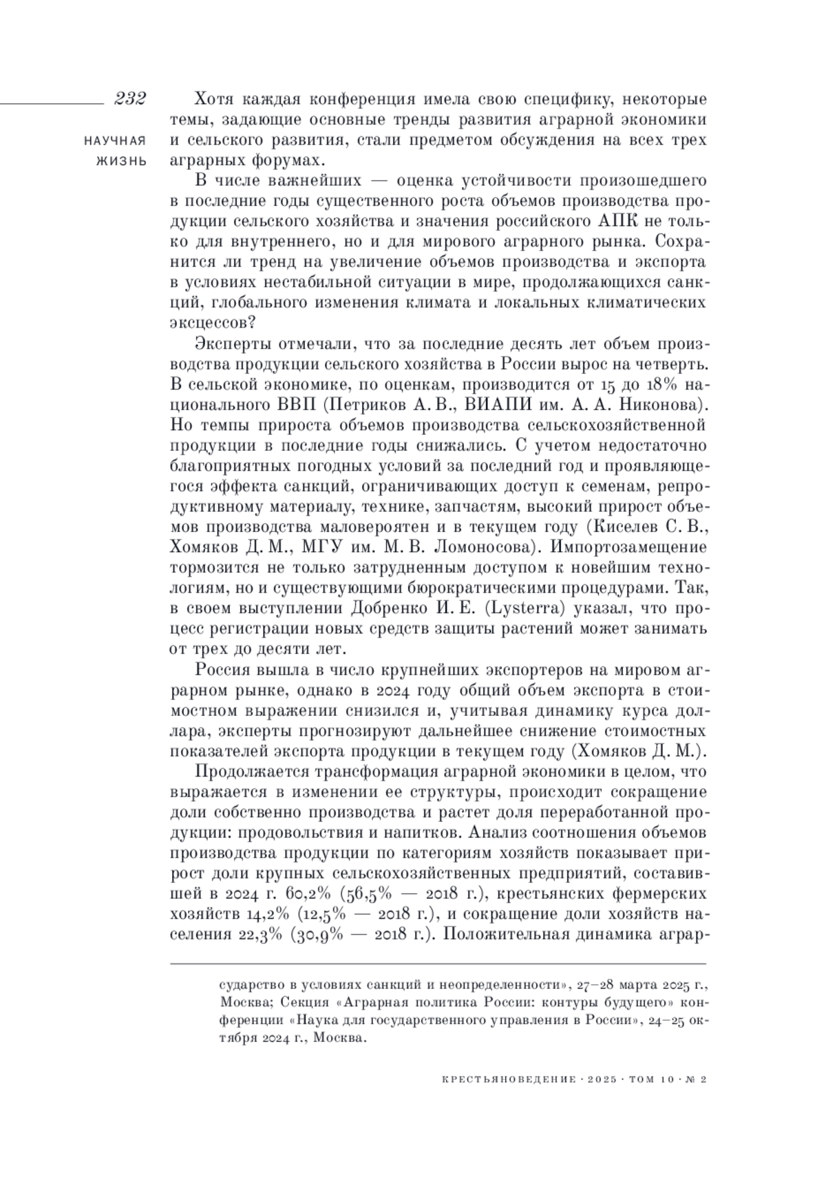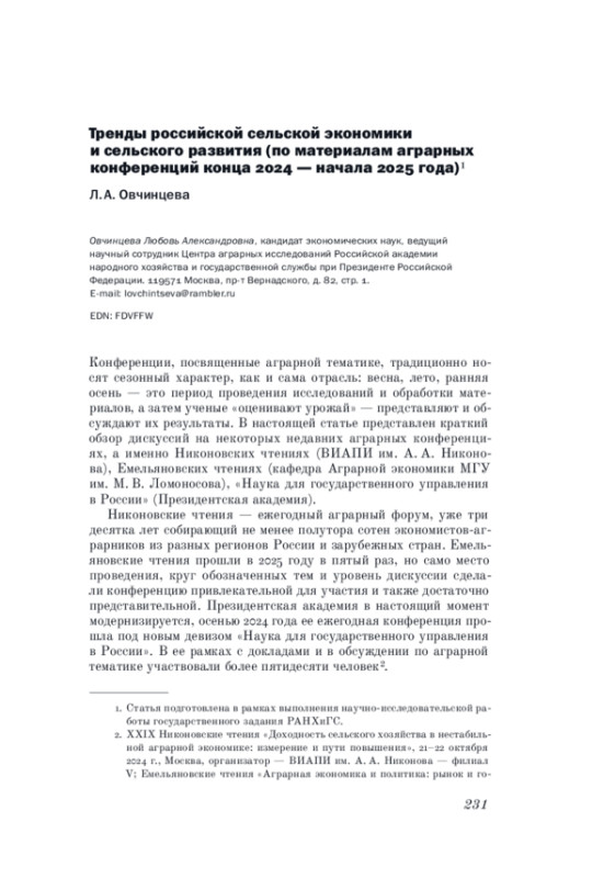 ОВЧИНЦЕВА Л. А. ТРЕНДЫ РОССИЙСКОЙ СЕЛЬСКОЙ ЭКОНОМИКИ И СЕЛЬСКОГО РАЗВИТИЯ (ПО МАТЕРИАЛАМ АГРАРНЫХ КОНФЕРЕНЦИЙ КОНЦА 2024 - НАЧАЛА 2025 ГОДА) // КРЕСТЬЯНОВЕДЕНИЕ. 2025. Т. 10 № 2