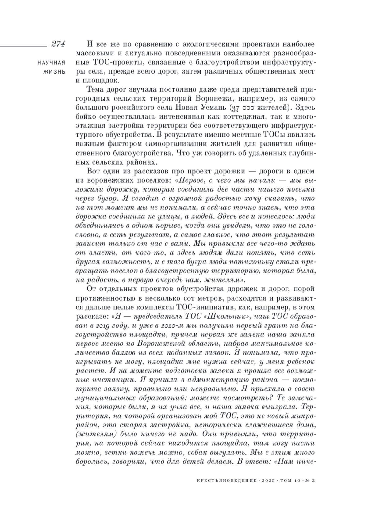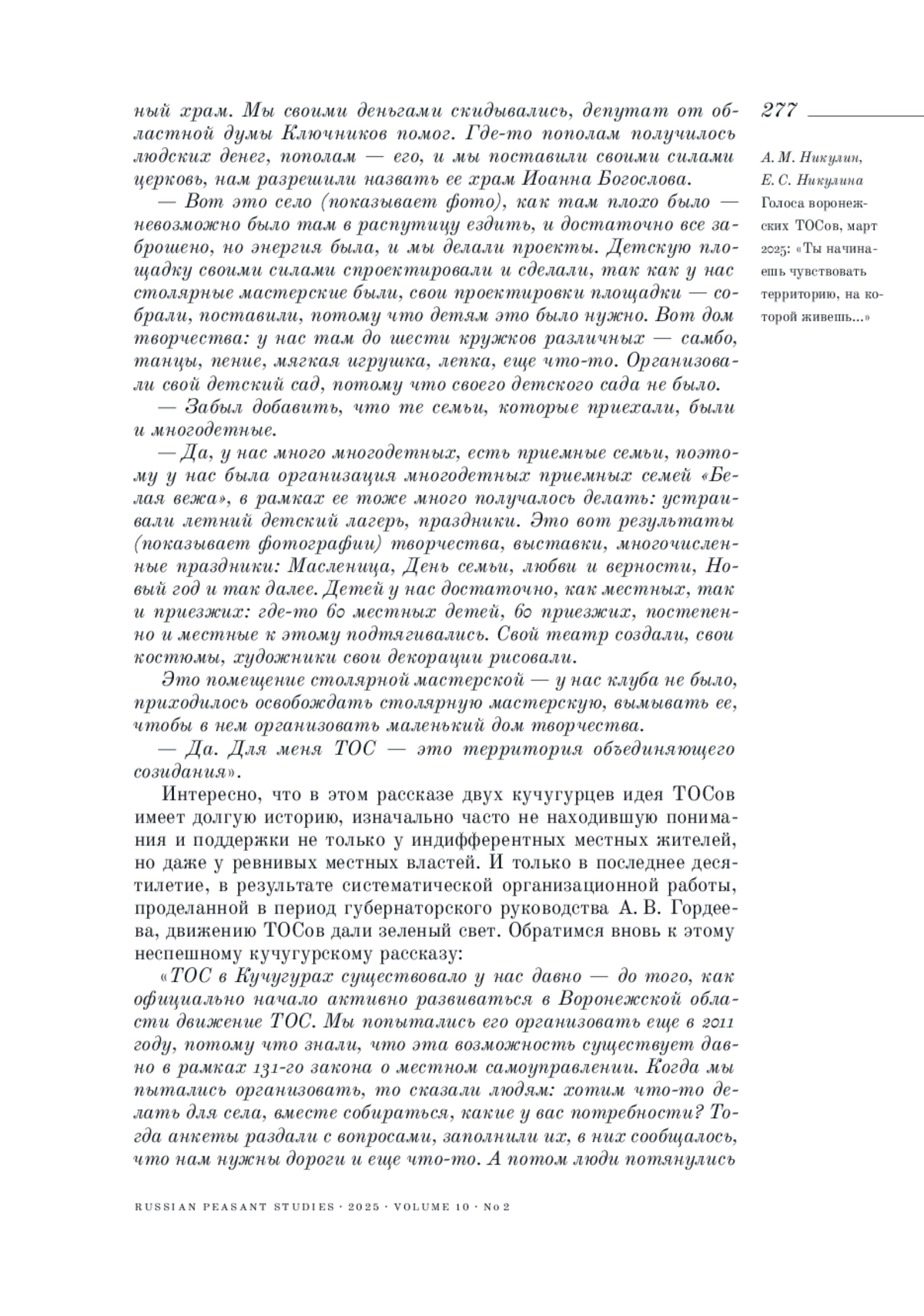 НИКУЛИН А. М., НИКУЛИНА Е. С. ГОЛОСА ВОРОНЕЖСКИХ ТОСОВ: «ТЫ НАЧИНАЕШЬ ЧУВСТВОВАТЬ ТЕРРИТОРИЮ, НА КОТОРОЙ ЖИВЕШЬ...» // КРЕСТЬЯНОВЕДЕНИЕ. 2025. Т. 10 № 2