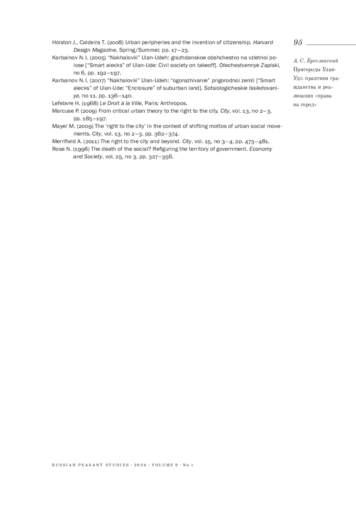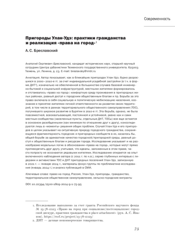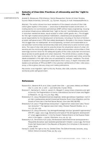 БРЕСЛАВСКИЙ А. С. ПРИГОРОДЫ УЛАН-УДЭ: ПРАКТИКИ ГРАЖДАНСТВА И РЕАЛИЗАЦИЯ "ПРАВА НА ГОРОД" // КРЕСТЬЯНОВЕДЕНИЕ. 2024. Т. 9 № 1