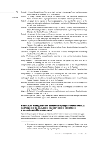 The article presents some methodological considerations on the possibilities and limitations of the qualitative approach (repeated case studies in the specific Russian region) for the sociological assessment of human capital. In the first part of the article, the author considers the Russian tradition of rural studies as combining two analytical ‘optics’ - sociological/ethnographic observations of local realities based on various combinations of qualitative techniques and a strong anthropological/ peasant-studies emphasis with large-scale social surveys aimed at macro-descriptions of agrarian reforms, rural social/human capital and agro-industrial complex under the persistent trends of social-spatial differentiation. In the second part, the author mentions the key possibilities and limitations of case studies for assessing the state and prospects of rural human capital in the most depressed rural region of Russia, focusing on the role of entrepreneurs in formal and informal support of the local rural economy and communities in cooperation with municipal and regional authorities. In the final part, the author emphasizes typologies as the analytical result of rural case studies (especially the repeated ones) and provides examples - ‘types’ of the local agricultural producer relationships with the rural settlement’s authorities and community (as the basis for preserving rural human capital) and ‘types’ of the rural entrepreneurs’ biographical trajectories (as the basis for the generational continuity of this differentiated rural stratum).