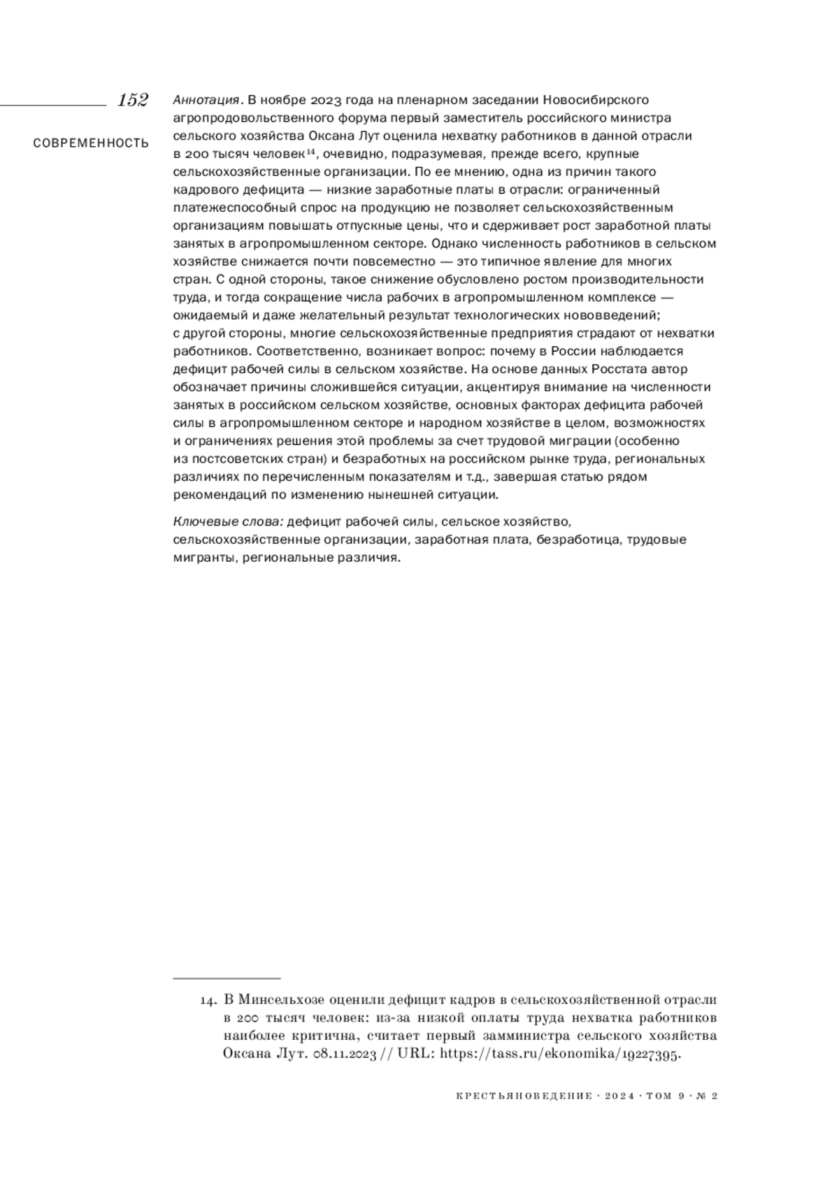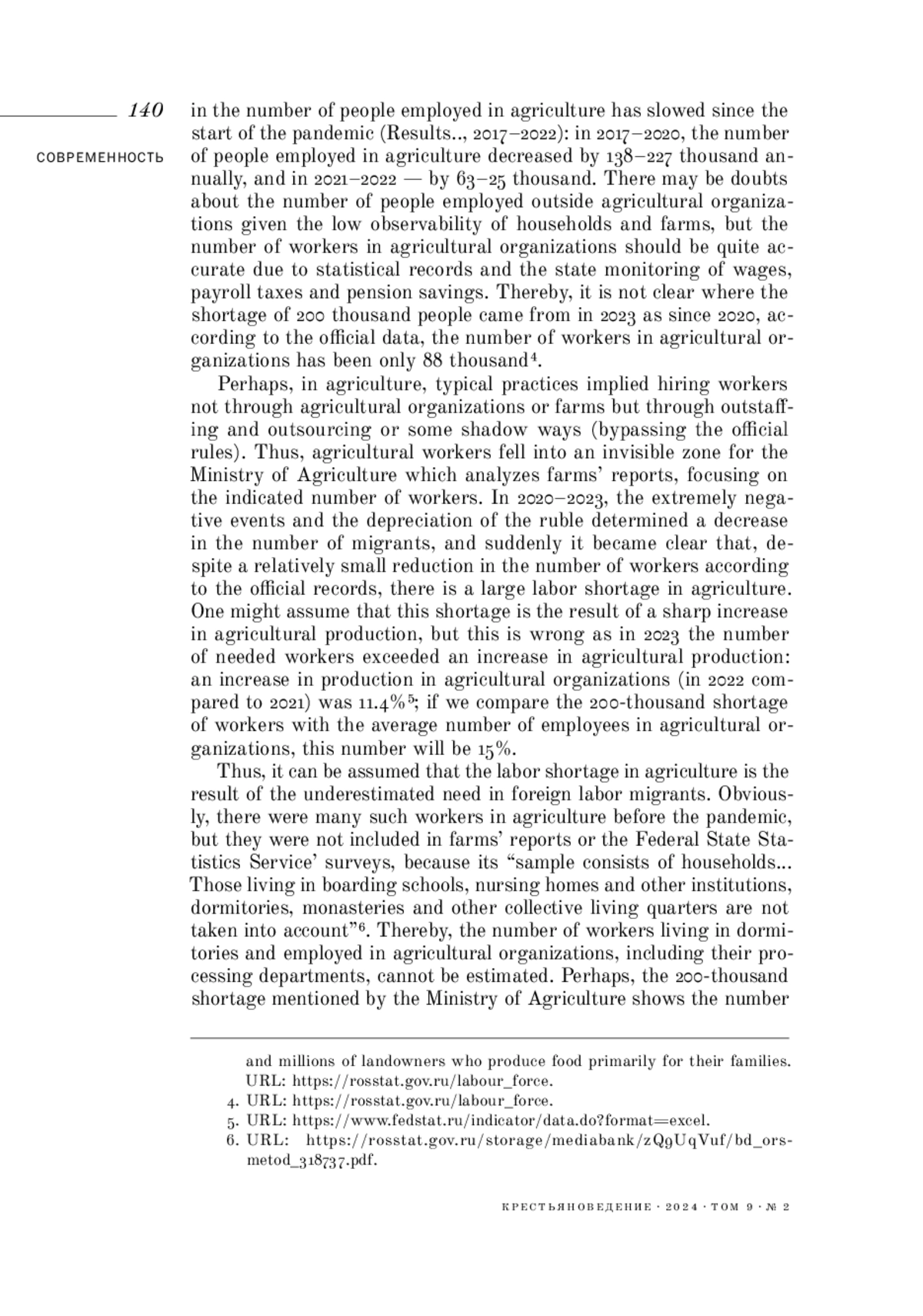 ШАГАЙДА Н. И. IS IT POSSIBLE TO QUICKLY ELIMINATE LABOR SHORTAGE IN RUSSIAN AGRICULTURE? // КРЕСТЬЯНОВЕДЕНИЕ. 2024. Т. 9 № 2