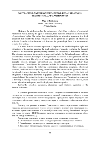 В статье дается характеристика основных аспектов гражданско-правового регулирования договорных отношений в России, а именно рассмотрены виды договоров, их элементы, принципы и механизмы защиты прав. Автором установлено, что договор об образовании - это юридический документ, который фиксирует взаимные обязательства сторон в процессе образовательной деятельности. Он может быть, как письменным, так и устным, однако для большей юридической силы рекомендуется оформлять его в письменной форме.