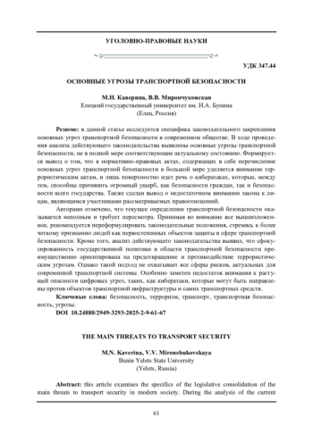 9. Челядинов Д.В., Полякова В.А. Угрозы транспортной безопасности Российской Федерации // ППД. - 2023. -№4 (54). - С. 69-72.