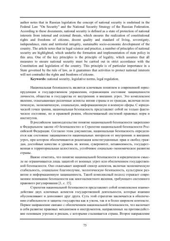 Статья посвящена анализу понятия и принципов национальной безопасности. Национальная безопасность рассматривается как комплексное явление, охватывающее различные аспекты жизни страны и ее граждан, включая политическую, экономическую, социальную, информационную и военную сферы. С юридической точки зрения, национальная безопасность представляет собой не только фактическое состояние, но и правовой режим, обеспечиваемый системой правовых норм и институтов. Автором отмечено, что в российском законодательстве понятие национальной безопасности закреплено в Федеральном законе «О безопасности» и Стратегии национальной безопасности Российской Федерации. Согласно этим документам, национальная безопасность определяется как состояние защищенности национальных интересов от внутренних и внешних угроз, при котором обеспечиваются реализация конституционных прав и свобод граждан, достойные качество и уровень их жизни, суверенитет, независимость, государственная и территориальная целостность, устойчивое социально-экономическое развитие страны. В статье отмечено, что в юридической науке и практике выделяется ряд принципов национальной безопасности, которые лежат в основе формирования и реализации государственной политики в этой сфере. Одним из ключевых принципов является принцип законности, который предполагает, что все меры по обеспечению национальной безопасности должны осуществляться в строгом соответствии с Конституцией и законодательством страны. Этот принцип имеет особое значение в правовом государстве, так как он гарантирует, что деятельность по защите национальных интересов не будет противоречить правам и свободам граждан.