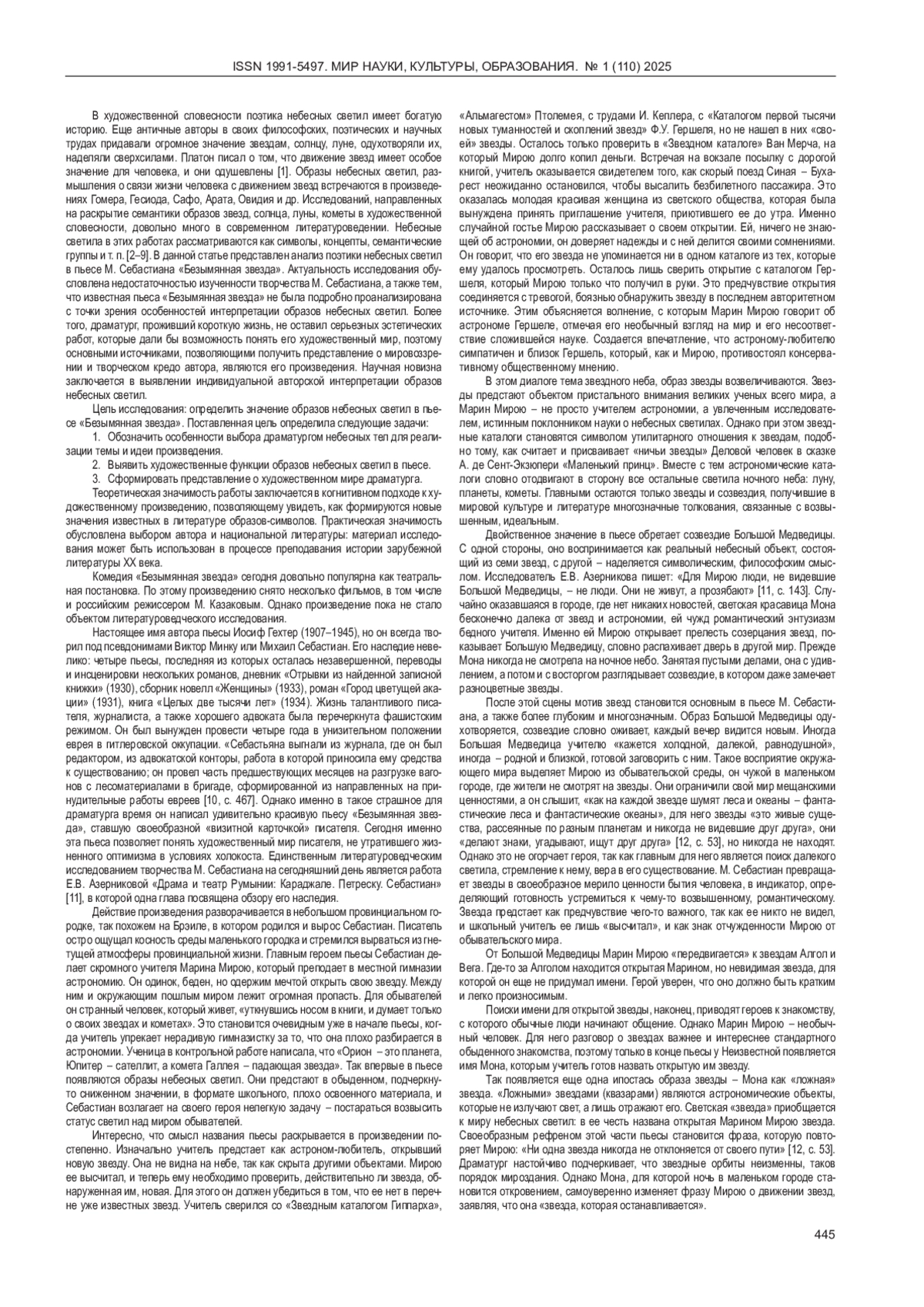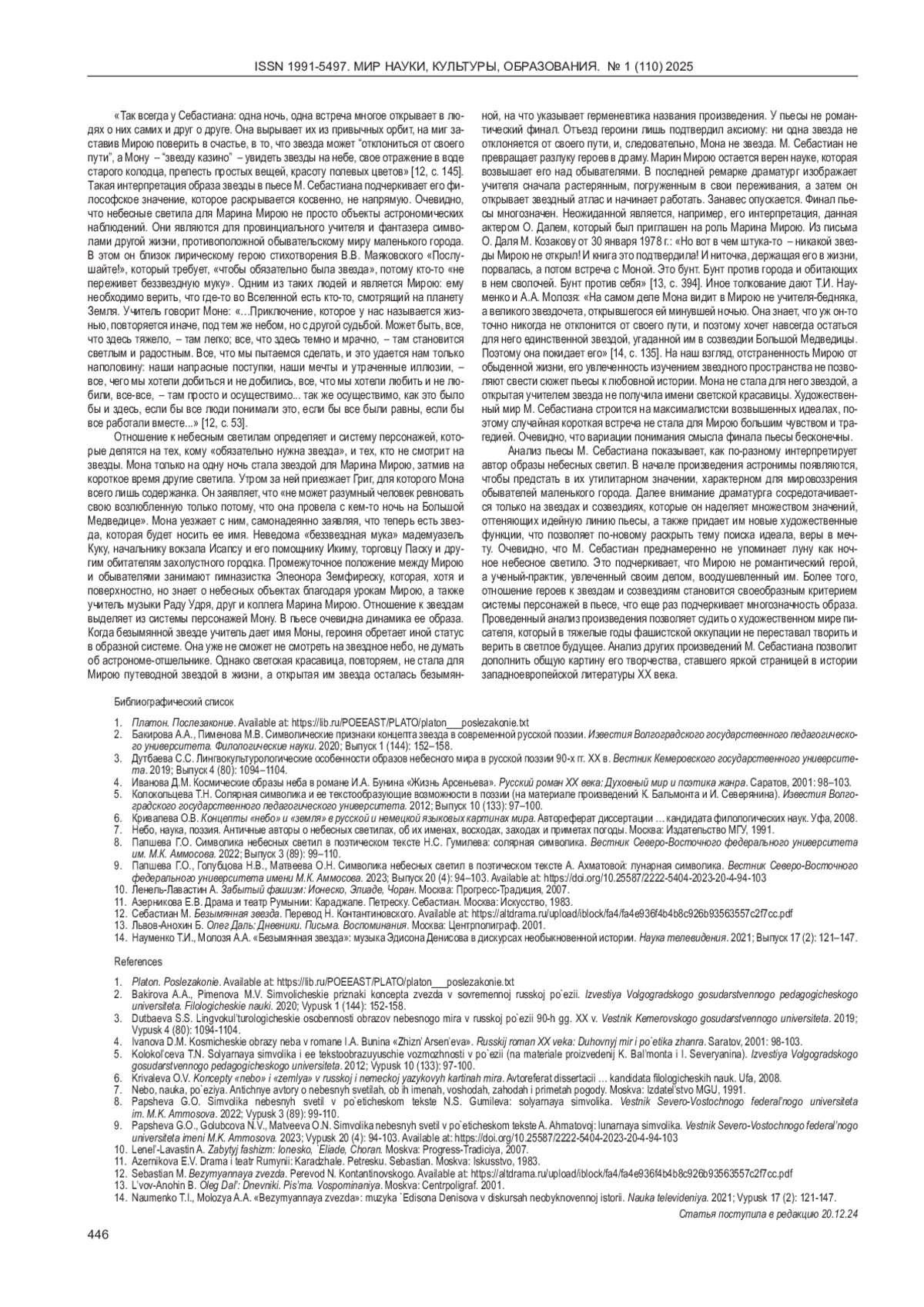 ИВАНОВА Е. Р. ПОЭТИКА НЕБЕСНЫХ СВЕТИЛ В ПЬЕСЕ М. СЕБАСТИАНА «БЕЗЫМЯННАЯ ЗВЕЗДА» // МИР НАУКИ, КУЛЬТУРЫ, ОБРАЗОВАНИЯ. 2025. № 1 (110)