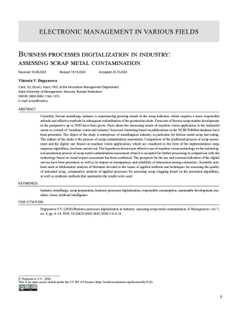 В настоящее время в отрасли черной металлургии наблюдаются растущие тенденции по показателю «ломообразование», что требует более ответственного отношения и эффективных способов в последующих переделах производственной цепочки. Приведены прогнозы развития рынка лома черных металлов в перспективе до 2030 г. Представлены факты о возрастающих тенденциях применения машинного зрения в промышленном секторе в результате проведения кластеризации ключевых слов «машинное зрение и промышленность» на основе публикаций, размещенных в базе данных NCBI PubMed. Объект исследования – предприятия металлургической отрасли, в частности по ломозаготовке черных металлов. Предмет исследования – процесс оценки засоренности лома. Проведено сравнение традиционного процесса оценки лома и цифрового (на основе применения машинного зрения), которые визуализированы в виде алгоритмов последовательности шагов их реализации. Подтверждена гипотеза о более эффективном использовании технологии машинного зрения в технологическом производственном процессе оценки засоренности металлолома при его приеме для дальнейшего передела по сравнению с технологией, основанной на визуально-экспертной оценке. Представлены перспективы использования и коммерциализации цифрового сервиса, а также его влияние на прозрачность и надежность взаимодействия между контрагентами. Использовались такие научные методы, как библиометрический анализ литературы, посвященный вопросам применяемых методов и способов оценки качества выгружаемого лома, сравнительный анализ применяемых процессов оценки засоренности лома на основе рассмотренных алгоритмов, а также методы синтеза, которые обобщают результаты.