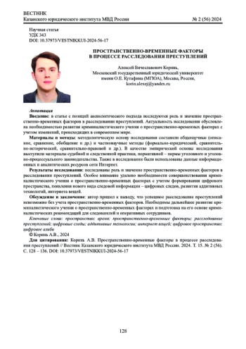 Введение: в статье с позиций аксиологического подхода исследуются роль и значение пространственно-временных факторов в расследовании преступлений. Актуальность исследования обусловлена необходимостью развития криминалистического учения о пространственно-временных факторах с учетом изменений, происходящих в современном мире.