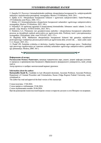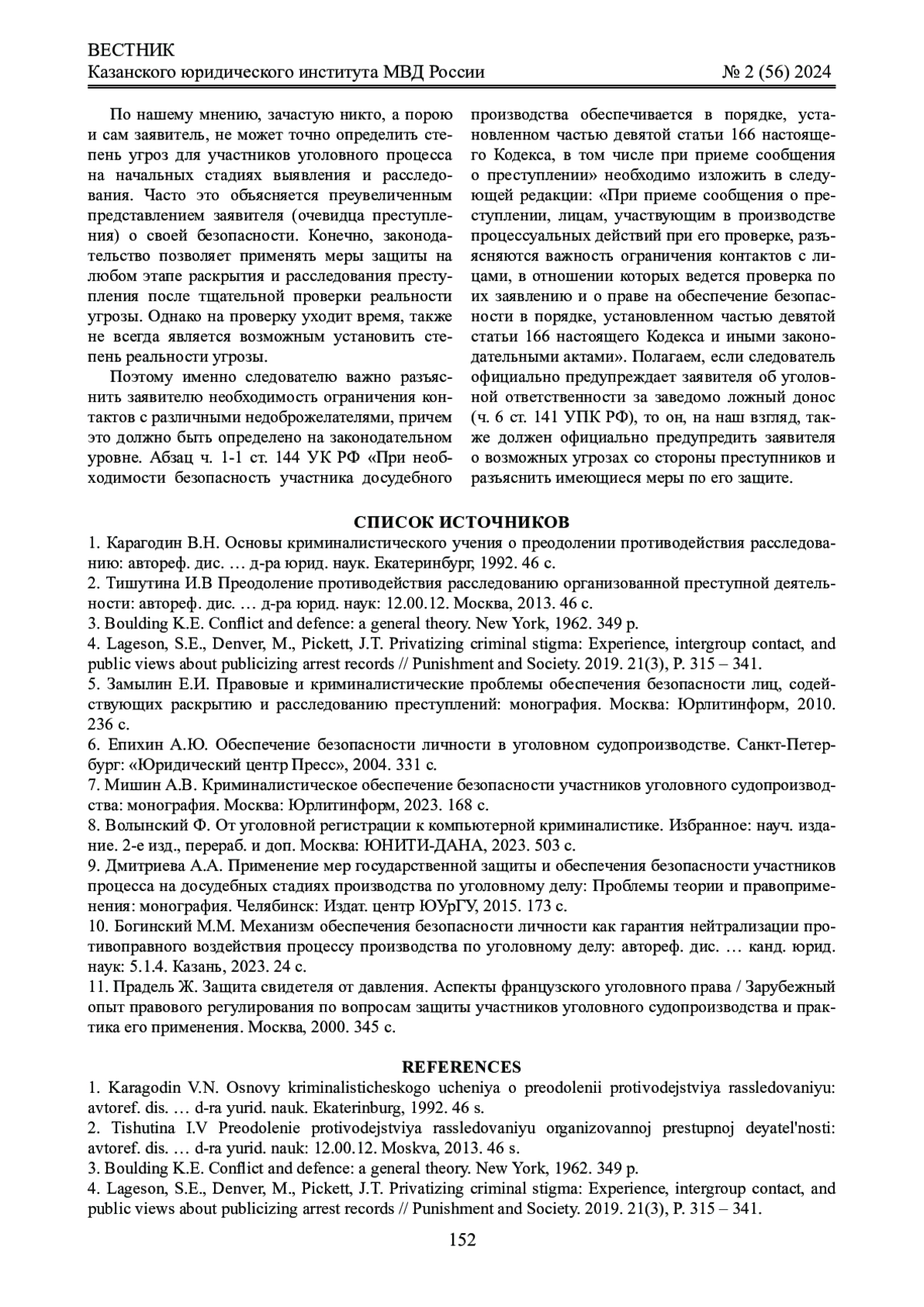 7. Мишин А.В. Криминалистическое обеспечение безопасности участников уголовного судопроизводства: монография. Москва: Юрлитинформ, 2023. 168 с. EDN: IKMABS