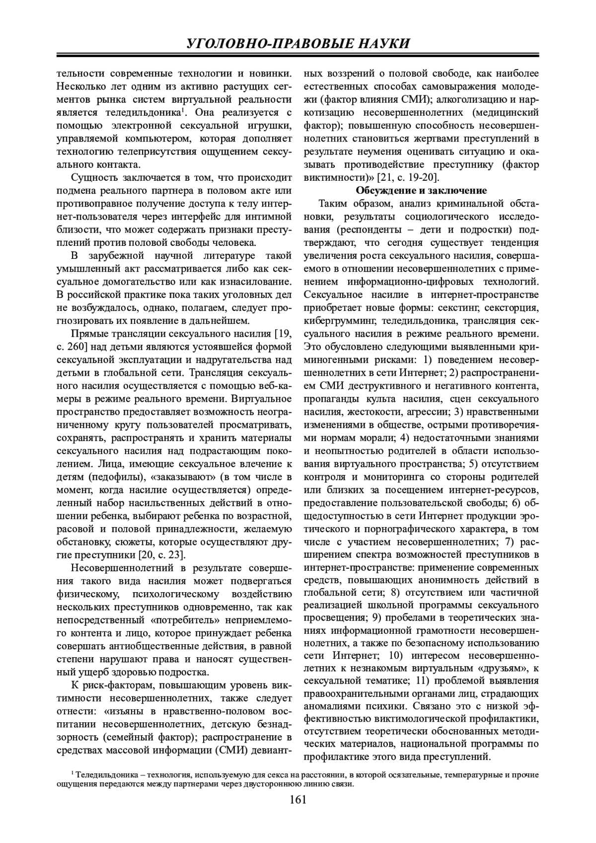 Обсуждение и заключение: сегодня существует тенденция увеличения роста сексуального насилия в отношении несовершеннолетних с применением информационно-цифровых технологий. С развитием цифровых технологий сексуальное насилие приобрело новые формы: секстинг, сексторция, кибергрумминг, теледильдоника, трансляция сексуального насилия в режиме реального времени. Складывающаяся ситуация требует создания соответствующих механизмов нормативно-правового, информационного, организационного, методологического противодействия сексуальному насилию над детьми в цифровой среде, а также взаимодействия правоохранительных органов и операторов сетей, провайдеров, родителей, педагогов и психологов на новом уровне с целью недопущения совершения рассматриваемых противоправных деяний.