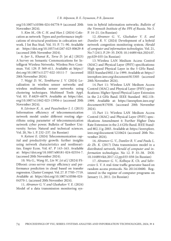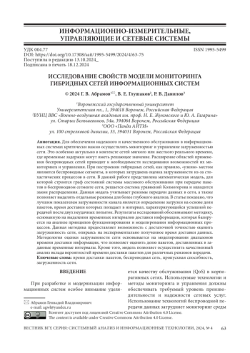 11. Абрамов Г. В. Модель системы мониторинга передачи данных в гибридных сетях / Г. В. Абрамов, В. Е. Глушаков // Вестник Воронежского института ФСИН России. - 2024. - № 3. - С. 14-21. EDN: FNFJYK