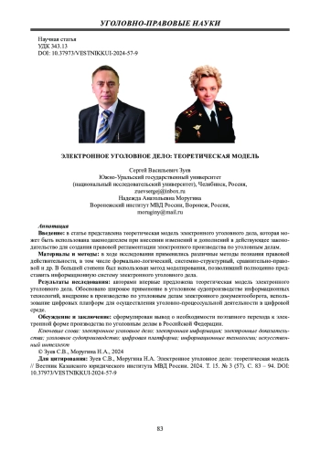 Введение: в статье представлена теоретическая модель электронного уголовного дела, которая может быть использована законодателем при внесении изменений и дополнений в действующее законодательство для создания правовой регламентации электронного производства по уголовным делам.