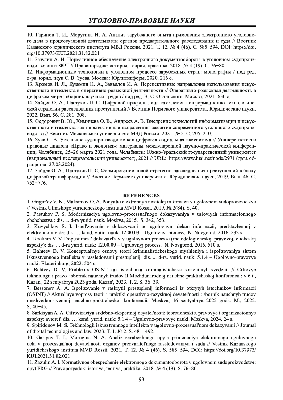 10. Гарипов Т. И., Моругина Н. А. Анализ зарубежного опыта применения электронного уголовного дела в процессуальной деятельности органов предварительного расследования и суда // Вестник Казанского юридического института МВД России. 2021. Т. 12. № 4 (46). С. 585-594. DOI: 10.37973/KUI.2021.31.82.021 EDN: PGLLSN