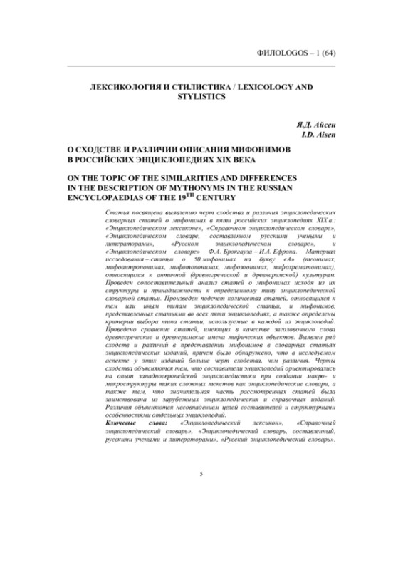 При создании современных российских энциклопедий, основанных на интеллектуальных технологиях представления и обработки научной информации, необходимо учитывать опыт составителей энциклопедий XIX в. Это и определило цель нашего исследования – выявление сходства и различия представления мифонимов в российских энциклопедиях XIX в. Ввиду незавершенности некоторых из них выбраны лишь 50 античных (древнегреческих и древнеримских) мифонимов на букву «А», вошедших в их словник. Задачи их исследования: 1) выявить особенности представления заголовочного слова в каждой из энциклопедий; 2) определить типы энциклопедических статей и критерии выбора типа статьи, используемые в каждой из энциклопедий; 3) рассмотреть, применяется ли в каждой из энциклопедий отсылочный способ подачи информации; 4) выяснить, присутствуют ли в энциклопедиях статьи, содержащие указание авторства.