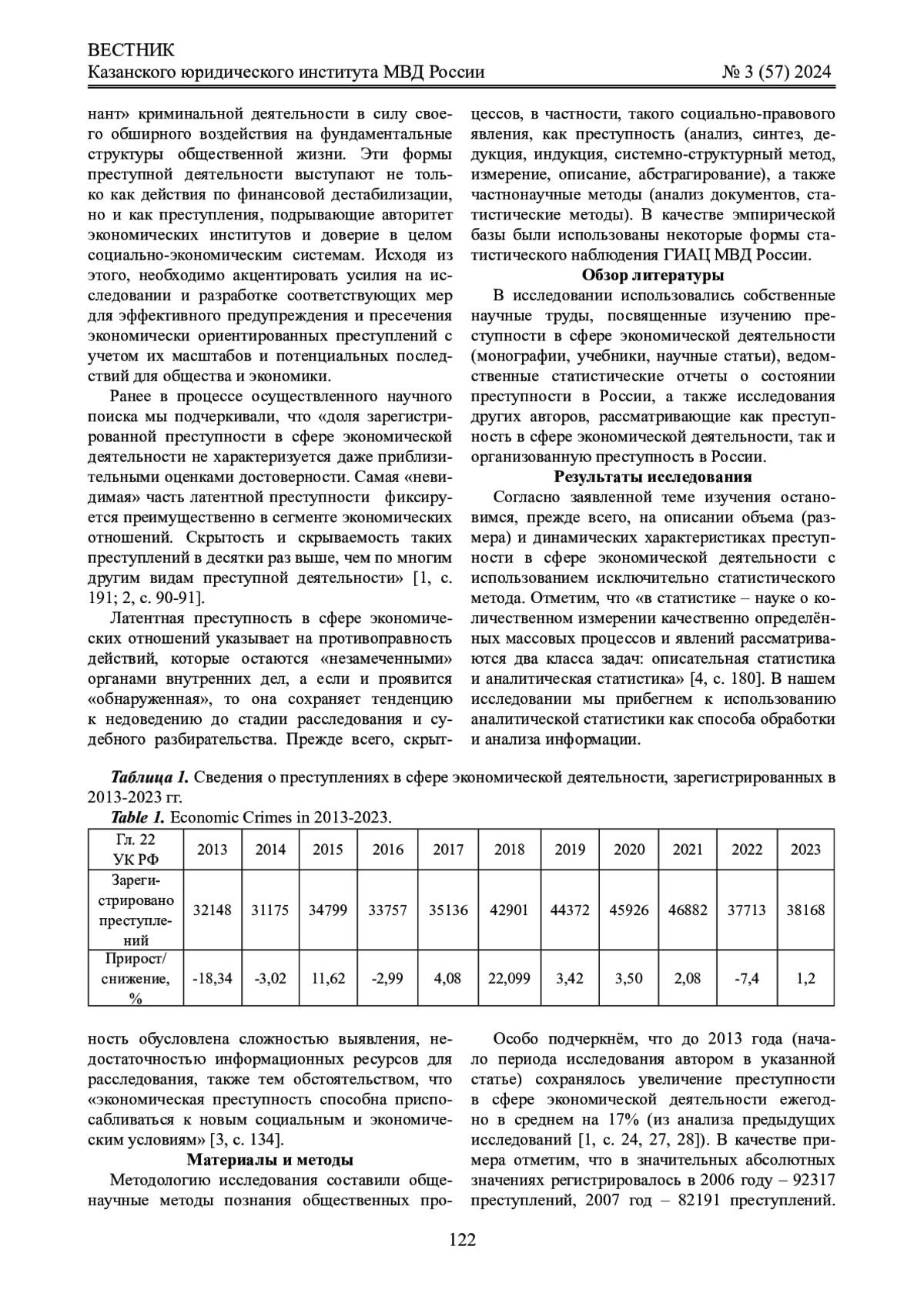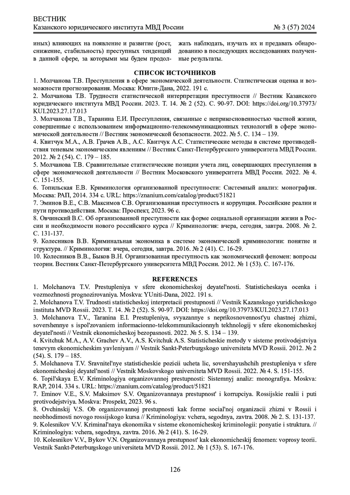 2. Молчанова Т.В. Трудности статистической интерпретации преступности // Вестник Казанского юридического института МВД России. 2023. T. 14. № 2 (52). С. 90-97. DOI: 10.37973/KUI.2023.27.17.013 EDN: NICXAK