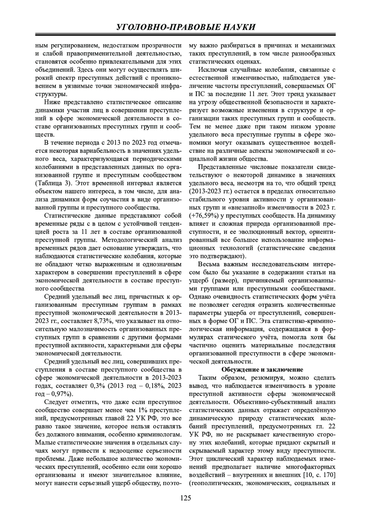 Обсуждение и заключение: автор пришел к выводу, что: 1. Числовые показатели преступлений в сфере экономической деятельности свидетельствуют о нестабильности динамики выявления и регистрации преступлений, предусмотренных главой 22 УК РФ, за период 11 лет. 2. Количественная динамика лиц, совершивших преступления в экономической сфере, обнаруживает в целом тенденцию к стабильному увеличению. 3. Организованная преступность в современном контексте выступает не просто как совокупность преступных действий, а как ключевой компонент сферы экономической деятельности.