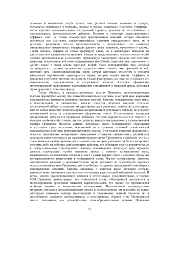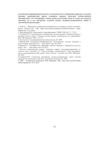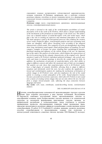 Статья посвящена изучению словообразовательных возможностей звукоописательных глаголов в произведениях М. Пришвина, что позволяет глубже понять механизмы формирования звуковых образов в художественном тексте. Авторы проводят детальный анализ звукоописательных глаголов и отглагольных существительных, которые играют ключевую роль в создании выразительной и эмоциональной атмосферы его произведений. Основное внимание уделяется деривационным процессам, обуславливающим создание новых слов. Выявляются продуктивные аффиксы, модели словообразования и способы формирования словообразовательных цепочек, что позволяет классифицировать глаголы по временным характеристикам звуковых сигналов птиц. Выделяются пять категорий глаголов: описывающие короткие, продолжительные, прерывистые звуковые сигналы, начальную и конечную фазы звучания. Для каждой категории приводятся примеры лексем, детализирующие их морфологические особенности, функциональное значение и влияние на стилистическое оформление текста. Важной частью исследования становится анализ отглагольных существительных, которые усиливают выразительность текста, сохраняя ключевые семантические характеристики исходных глаголов. Особое внимание уделяется индивидуально-авторским приемам М. Пришвина, который активно использует глаголы и существительные в непривычных значениях для описания звуков, издаваемых птицами. Кроме того, исследуются механизмы полисемии звукоописательных глаголов, их способность адаптироваться к различным контекстам и отражать эмоциональное состояние птиц. Анализ не только показывает, что звукоописательные глаголы в произведениях М. Пришвина обладают высокой степенью семантической гибкости, позволяя им адаптироваться в различных ситуациях и стилистически обогащать тексты, но и подтверждает значимость лексико-словообразовательного анализа для изучения механизмов формирования художественных образов в текстах М. Пришвина, а также подчеркивает роль звуковой палитры в создании определенной атмосферы его произведений. Звукоподражательные лексемы становятся мощным инструментом художественной выразительности, которые позволяют М. Пришвину превращать звук в средство создания различных образов, способных не только оживлять текст, но и формировать уникальный лексико-семантический код, отражающий глубинную связь языка и природы.