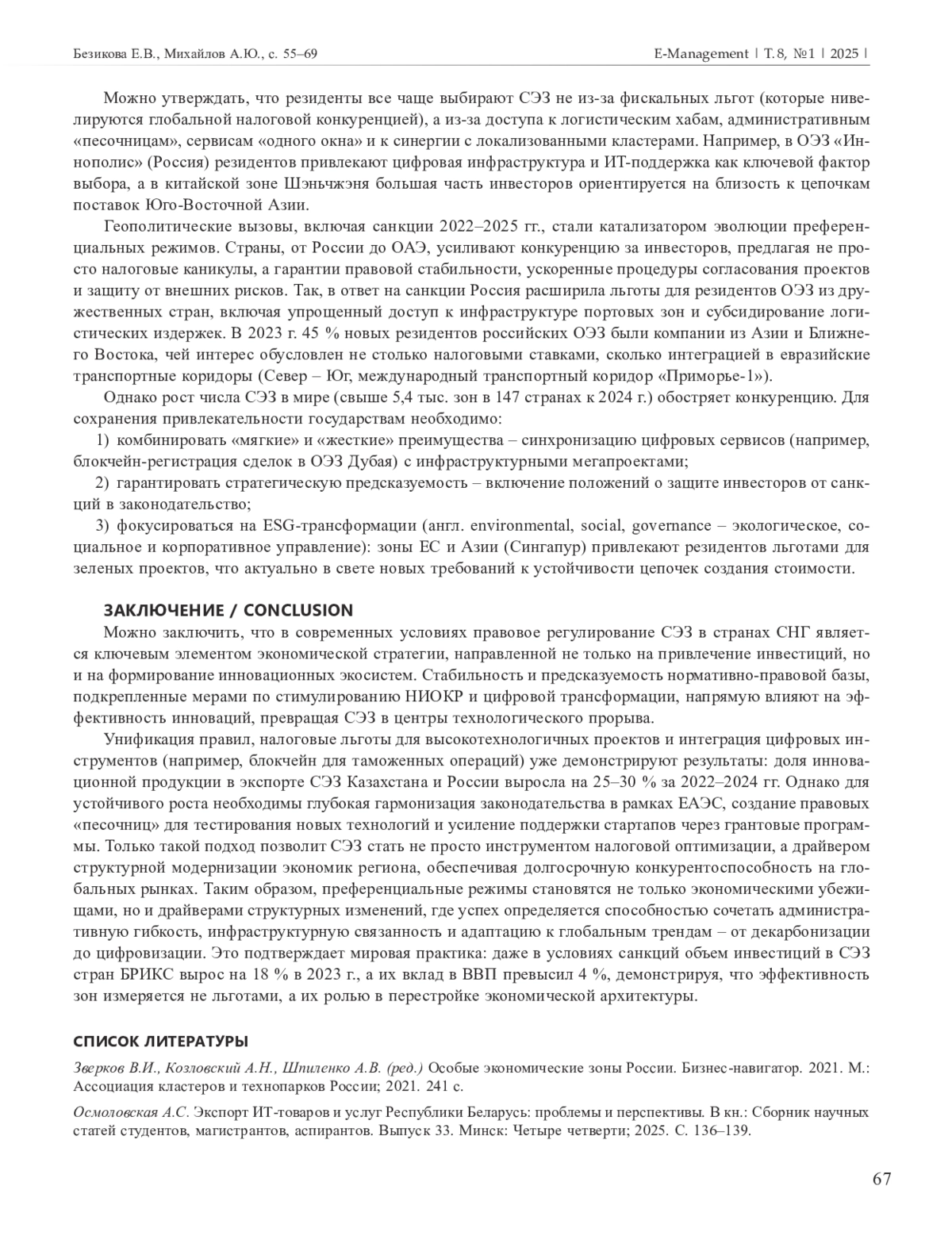 Эта работа представляет собой комплексное исследование международного инвестиционного сотрудничества и концепции эффективности инноваций на рынке капитала в свободных экономических зонах (далее – СЭЗ) и их роли в современном мире. СЭЗ являются новыми центрами компетенций в различных социально-экономических и производственных сферах, способствуя развитию международного инвестиционного сотрудничества. В условиях современных рыночных отношений они могут стать катализатором структурных преобразований, стимулируя инновации, привлечение капиталовложений и обмен технологиями. Так, в условиях глобальной экономической трансформации и усиления конкуренции за технологическое лидерство СЭЗ становятся ключевым инструментом стимулирования инноваций и привлечения инвестиций. Финансовая деятельность, являясь ключевой сферой экономики, не только обеспечивает стабильность и устойчивость хозяйствующих субъектов, но и выступает драйвером инноваций, которые критически важны для повышения конкурентоспособности, оптимизации ресурсного управления и адаптации к глобальным вызовам, таким как цифровизация и санкционное давление. Анализ правовых моделей СЭЗ в странах Содружества Независимых Государств демонстрирует их разнонаправленность. В Российской Федерации, например, акцент сделан на промышленно-производственных зонах, где льготы увязаны с локализацией производств. В Китае, напротив, доминируют инновационно-технологические кластеры, предлагающие гранты на научно-исследовательские и опытно-конструкторские работы и упрощенную миграцию кадров.