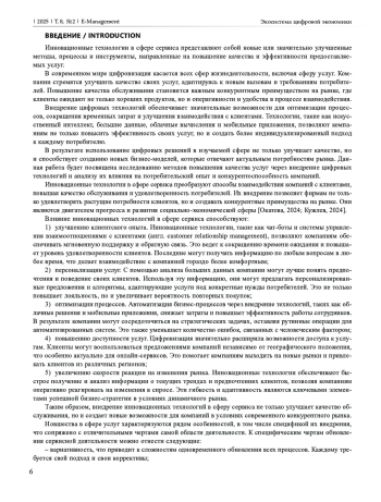 Предметом данной статьи выступают цифровые технологии и инновации в сфере услуг, исследуемые с точки зрения их воздействия на повышение качества и эффективности предоставляемых услуг, а также формирования конкурентных преимуществ на рынке. Цель состоит в изучении возможностей цифровых технологий и анализе путей их внедрения в практику сервисных компаний для улучшения качества обслуживания и достижения устойчивого роста бизнеса. Методология включает теоретический обзор научных публикаций и практических исследований, касающихся цифровой трансформации в секторе услуг. Используются аналитические подходы, основанные на количественной оценке влияния технологий на показатели удовлетворенности клиентов и прибыльность компаний. Полученные выводы применимы в организациях сферы услуг, ориентированных на предоставление качественных продуктов и высокий уровень клиентского сервиса. Результаты могут использоваться менеджерами среднего и высшего звена для разработки стратегий цифрового преобразования, направленных на повышение операционной эффективности и конкурентоспособности. Для полноценного освоения потенциала инноваций необходимы комплексные подходы, учитывающие технологические, организационные и культурные аспекты функционирования компаний.