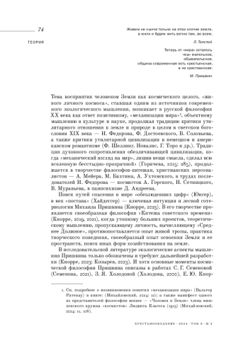 КНОРРЕ Е. Ю. ФИЛОСОФИЯ ЗЕМЛИ М. М. ПРИШВИНА В КОНТЕКСТЕ ЭКОТЕОЛОГИИ // КРЕСТЬЯНОВЕДЕНИЕ. 2024. Т. 9 № 3