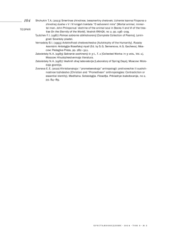 26. Щукин Т. А. (2023). Смертное животное, бессмертный человек. Учение Иоанна Филопона о животной душе в V и VI книгах трактата “О сотворении мира” // Вестник Русской христианской гуманитарной академии Т. 24. № 2. С. 196-209. EDN: GZCTRR
