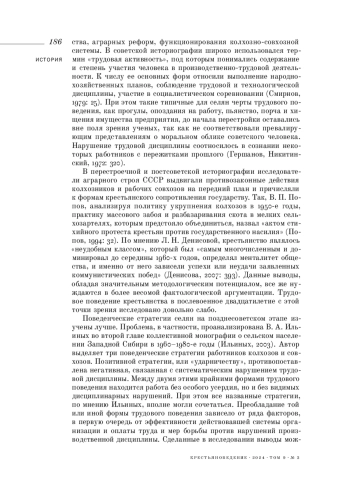 Необходимость изучения заявленной темы обусловлена ее весомой ролью в решении важнейших для понимания отечественной истории вопросов: особенностей модернизации сельского хозяйства, аграрных реформ, функционирования колхозно-совхозной системы. В советской историографии широко использовался термин «трудовая активность», под которым понимались содержание и степень участия человека в производственно-трудовой деятельности. К числу ее основных форм относили выполнение народнохозяйственных планов, соблюдение трудовой и технологической дисциплины, участие в социалистическом соревновании (Смирнов, 1979: 25). При этом такие типичные для селян черты трудового поведения, как прогулы, опоздания на работу, пьянство, порча и хищения имущества предприятия, до начала перестройки оставались вне поля зрения ученых, так как не соответствовали превалирующим представлениям о моральном облике советского человека. Нарушение трудовой дисциплины соотносилось в сознании некоторых работников с пережитками прошлого (Гершанов, Никитинский, 1972: 320).