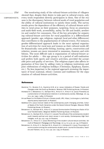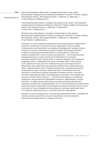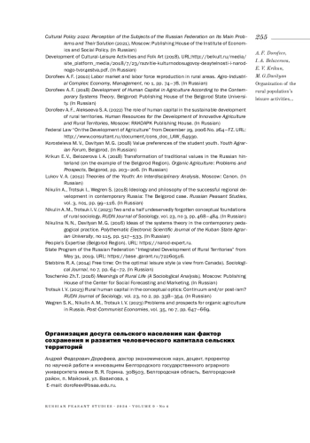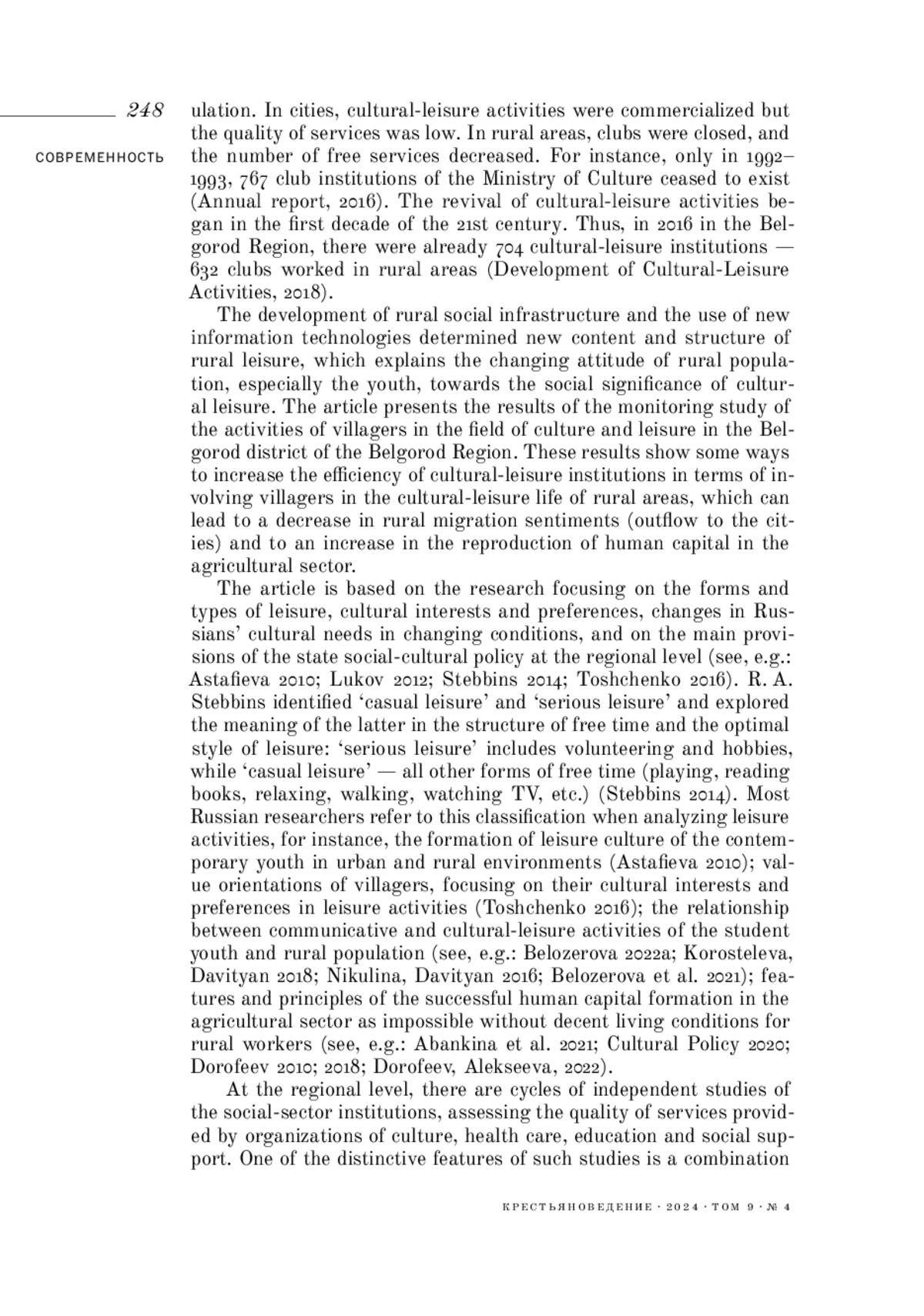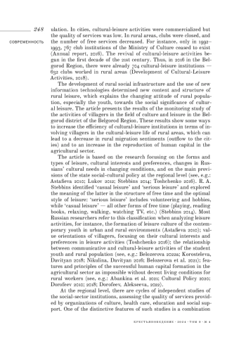 ДОРОФЕЕВ А. Ф., БЕЛОЗЕРОВА И. А., КРИКУН Е. В., ДАВИТЯН М. Г. ORGANIZATION OF THE RURAL POPULATION'S LEISURE ACTIVITIES AS A FACTOR OF PRESERVATION AND DEVELOPMENT OF THE RURAL HUMAN CAPITAL // КРЕСТЬЯНОВЕДЕНИЕ. 2024. Т. 9 № 4