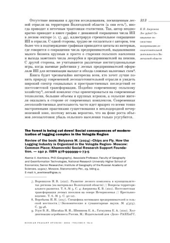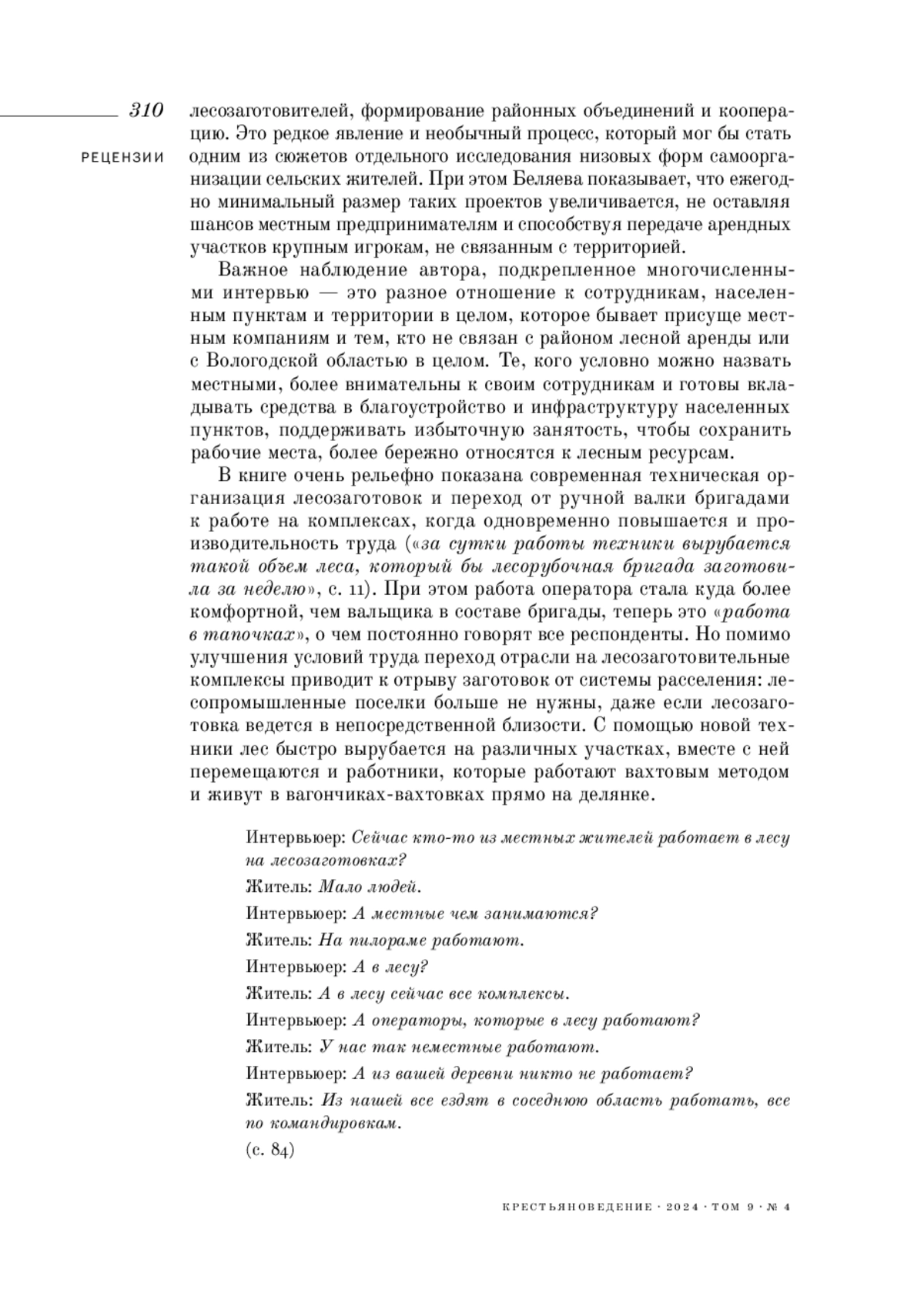 АВЕРКИЕВА К. В. ЛЕС РУБЯТ! СОЦИАЛЬНЫЕ ПОСЛЕДСТВИЯ МОДЕРНИЗАЦИИ ЛЕСОЗАГОТОВИТЕЛЬНОЙ ДЕЯТЕЛЬНОСТИ В ВОЛОГОДСКОЙ ОБЛАСТИ // КРЕСТЬЯНОВЕДЕНИЕ. 2024. Т. 9 № 4