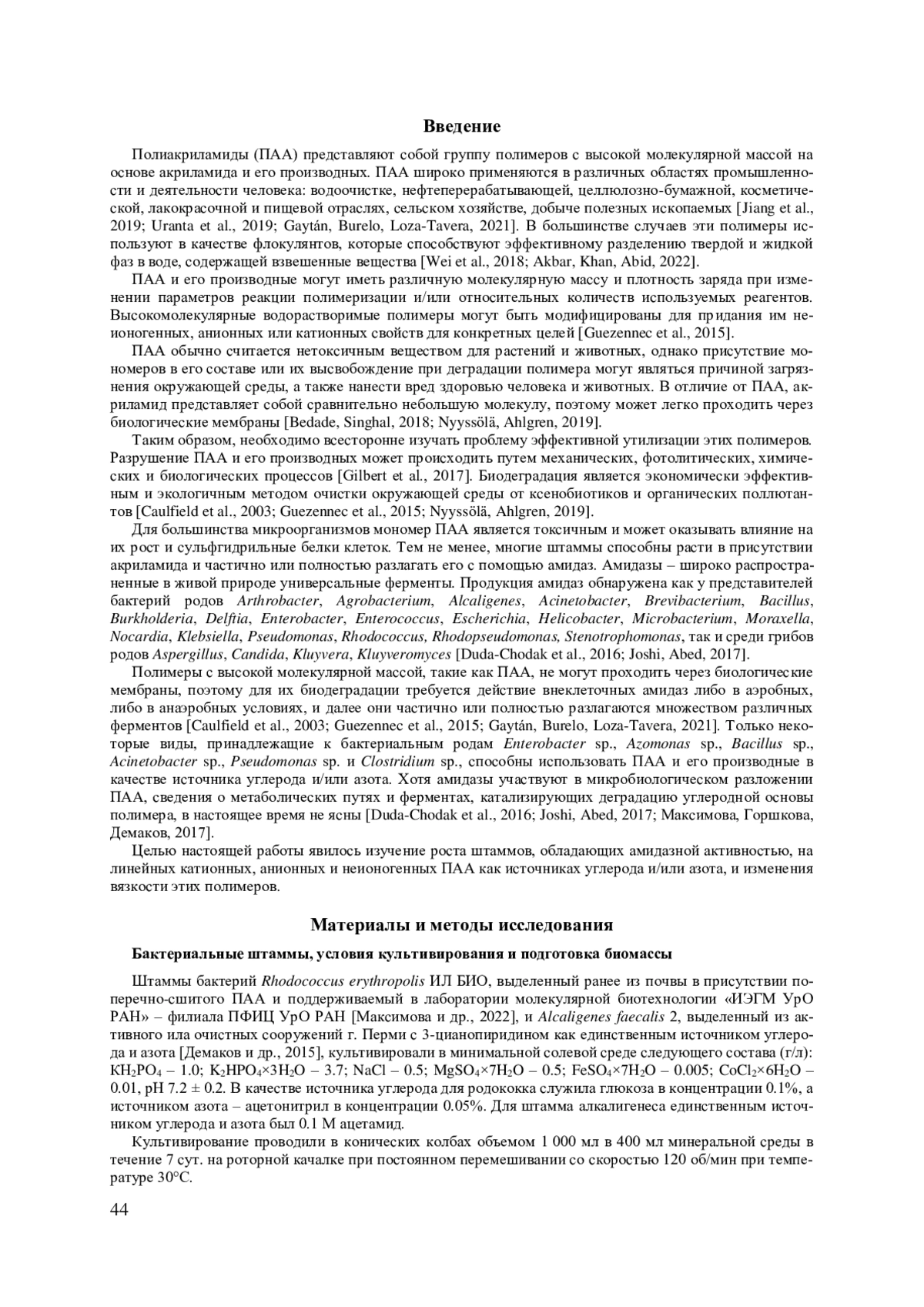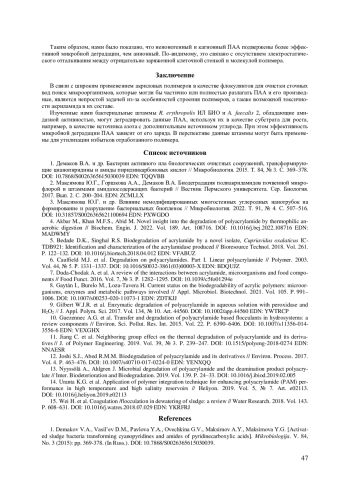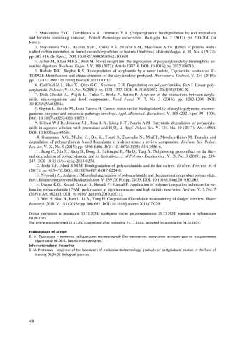 13. Nyyssölä A., Ahlgren J. Microbial degradation of polyacrylamide and the deamination product polyacrylate // Inter. Biodeterioration and Biodegradation. 2019. Vol. 139. P. 24-33. DOI: 10.1016/j.ibiod.2019.02.005