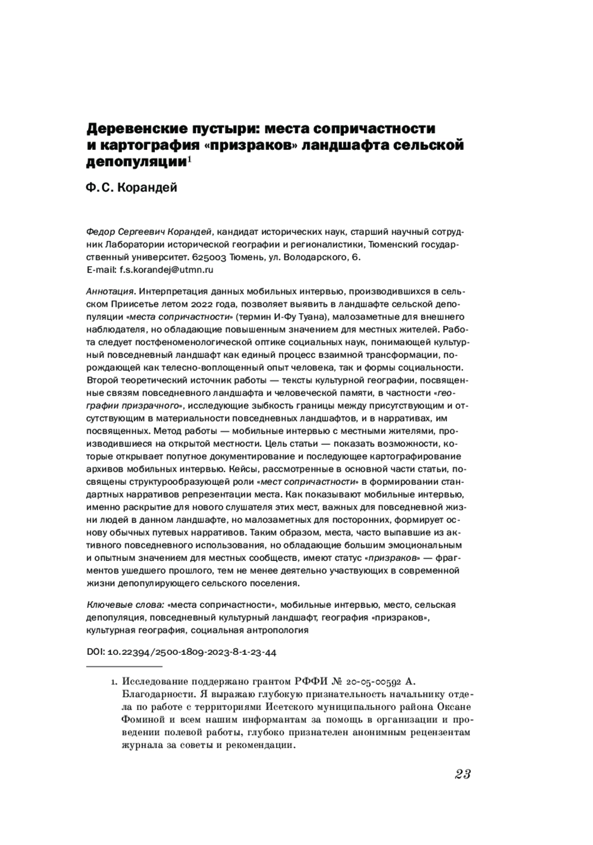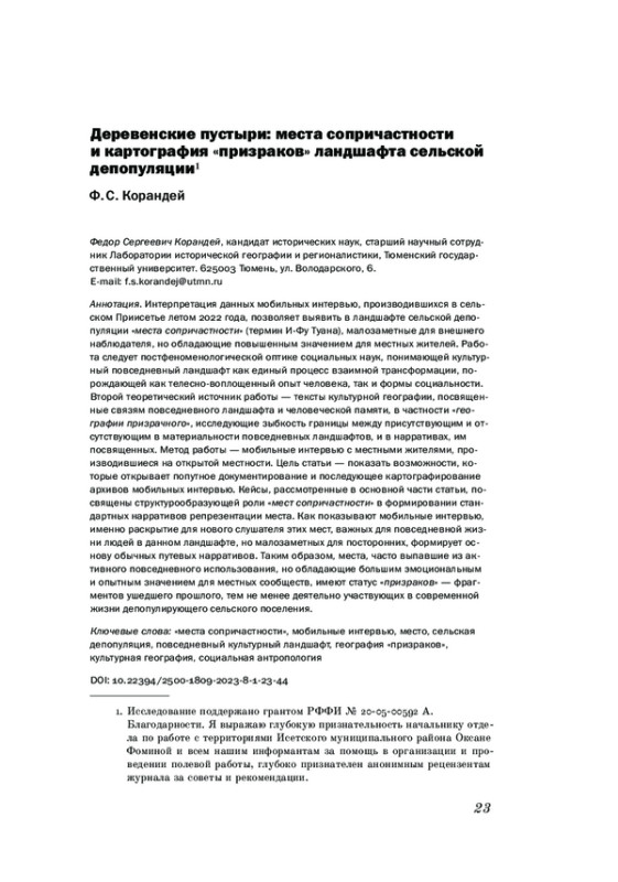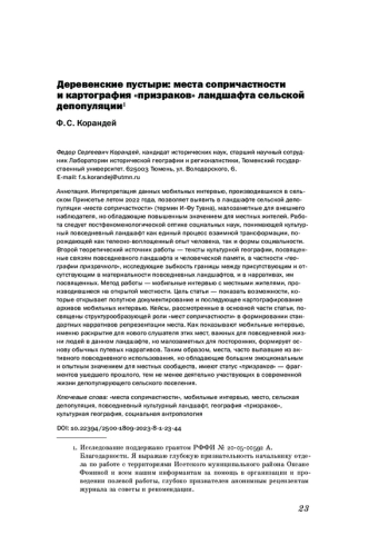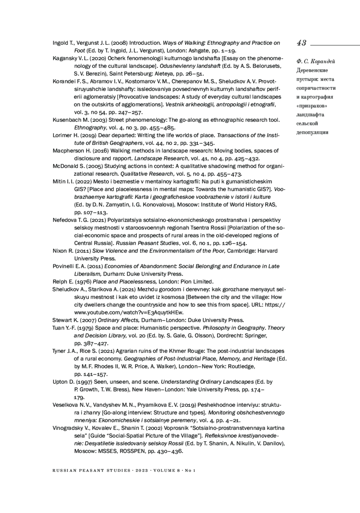 КОРАНДЕЙ Ф. С. ДЕРЕВЕНСКИЕ ПУСТЫРИ: МЕСТА СОПРИЧАСТНОСТИ И КАРТОГРАФИЯ "ПРИЗРАКОВ" ЛАНДШАФТА СЕЛЬСКОЙ ДЕПОПУЛЯЦИИ // КРЕСТЬЯНОВЕДЕНИЕ. 2023. Т. 8 № 1