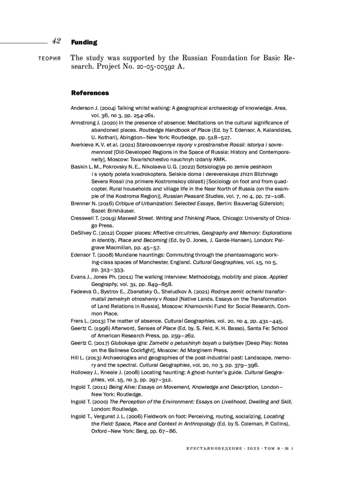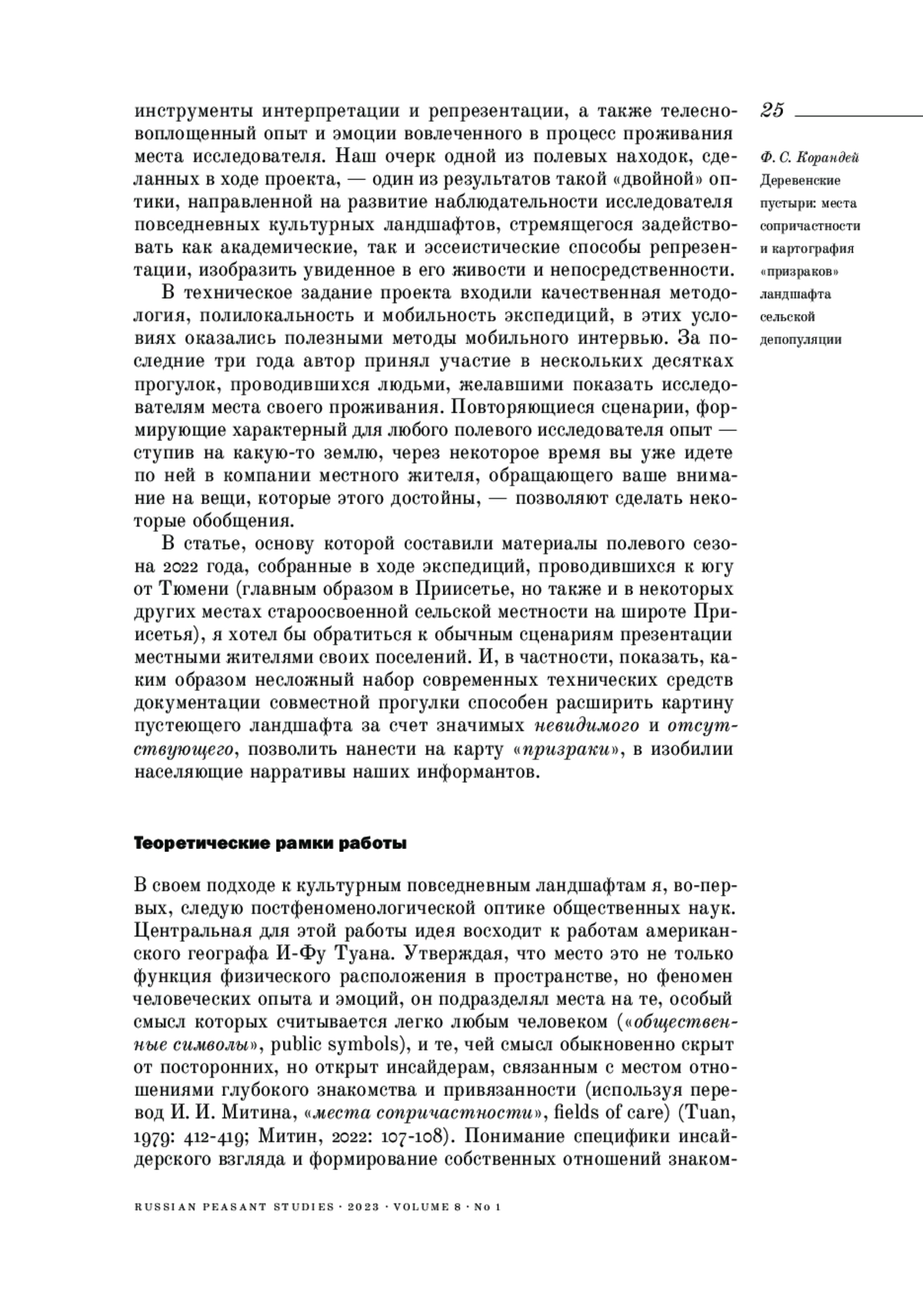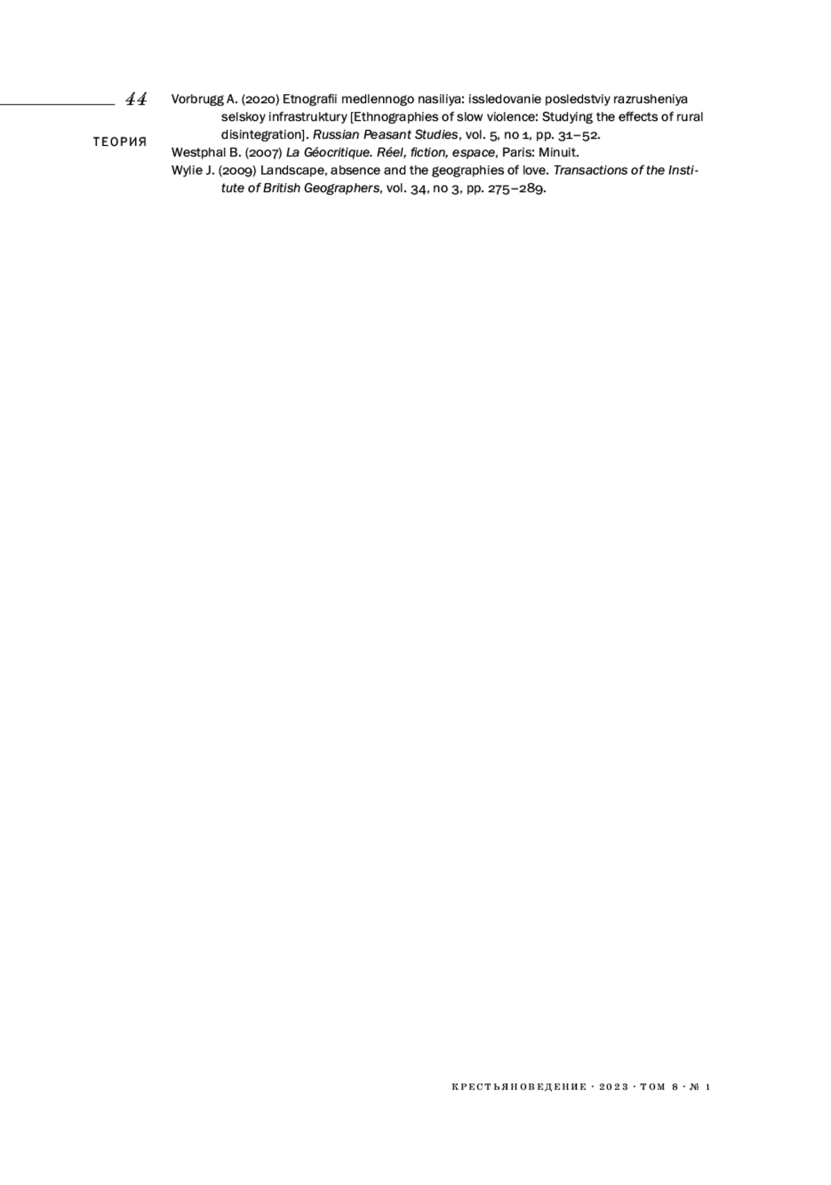 КОРАНДЕЙ Ф. С. ДЕРЕВЕНСКИЕ ПУСТЫРИ: МЕСТА СОПРИЧАСТНОСТИ И КАРТОГРАФИЯ "ПРИЗРАКОВ" ЛАНДШАФТА СЕЛЬСКОЙ ДЕПОПУЛЯЦИИ // КРЕСТЬЯНОВЕДЕНИЕ. 2023. Т. 8 № 1