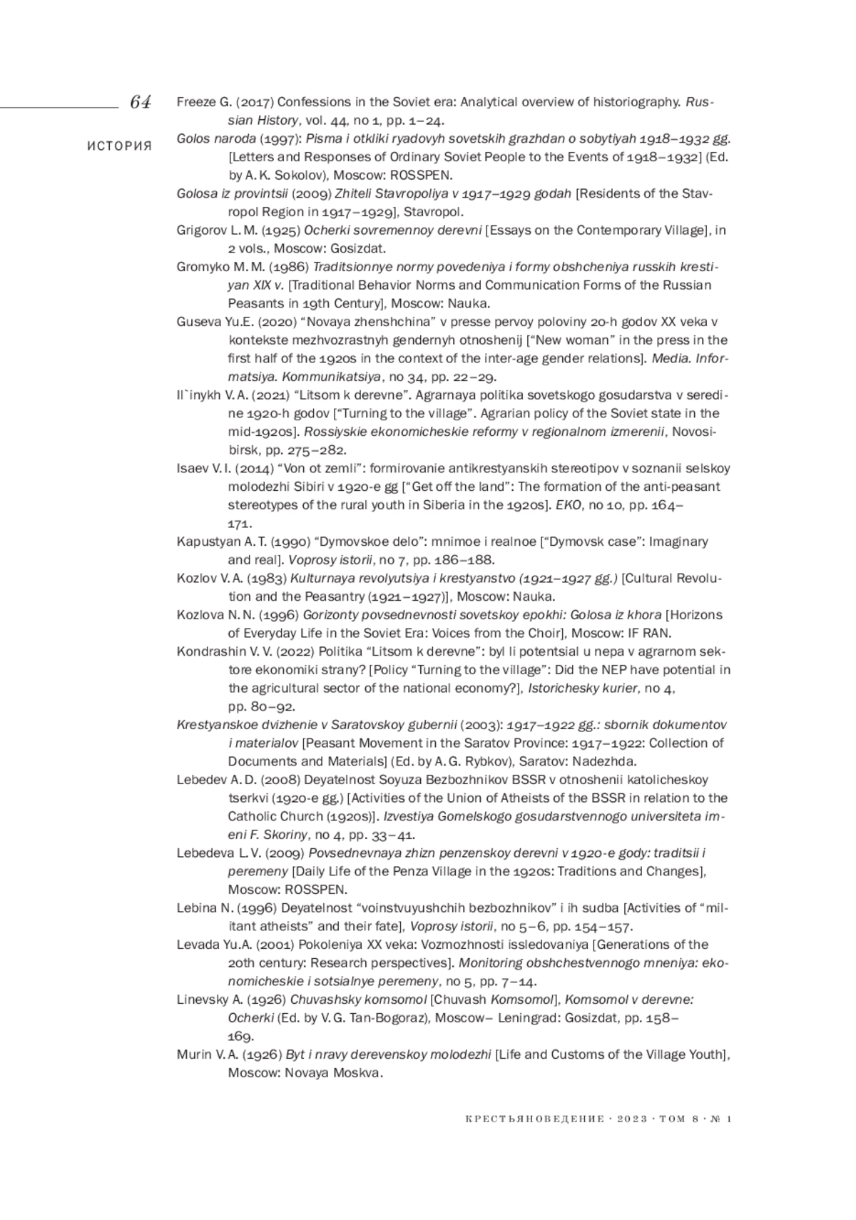 32. Слезин А. А. (2023). Противостояние крестьян и комсомольцев в духовной сфере русской деревни начала 1920-х годов // Аграрная история. № 13. С. 22-42. EDN: VSLZJI