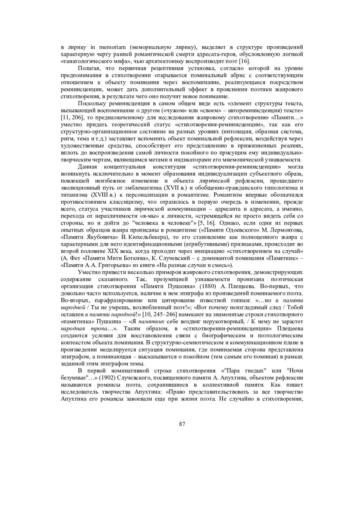 Стихотворение «Памяти…» неоднократно становилось предметом изучения в трудах современных исследователей. Так, Д. Н. Ахапкин весь комплекс лирических текстов с типическими номинативами «Памяти…» и «На смерть…» сводит в отдельную группу «стихотворений in memoriam, которые имеют сходную тематику и структуру и могут быть описаны как отдельное жанровое образование» [2, 123].