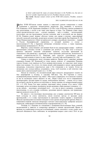 Рубеж XVIII–XIX веков можно назвать в известной степени поворотным в плане отношения к женскому литературному творчеству. Под влиянием, в частности, Н. И. Новикова и Н. М. Карамзина женщина в 70–90-е годы XVIII века сначала развивается как читательница, а потом и все чаще сама берется за перо. Так, Новиков ставит перед собой просветительскую цель – «сделать женщину – мать и хозяйку – читательницей, подготовить для нее продуманную систему полезных книг в доступной для нее форме» [9, 54]. Новиков издает журнал «Детское чтение для сердца и разума», адресованный детской и женской аудитории, редактором которого некоторое время был Карамзин [9, 54]. Также Новиков выпустил «Опыт исторического словаря о российских писателях» – первый в России биографический справочник, в который включил и статьи о писательницах [17, 16], а Карамзин публиковал сочинения поэтесс, а также переводы, выполненные женщинами [11, 40–41].