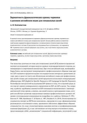 В данной статье рассматриваются варианты фразеологических единиц-терминов делового английского языка для специальных целей. Целью работы явился семантический анализ вариантов фразеотерминов с установлением степени переосмысления компонентного состава. В результате исследования было установлено, что варианты ФЕ-терминов могут демонстрировать как полное, так и частичное переосмысление компонентного состава.