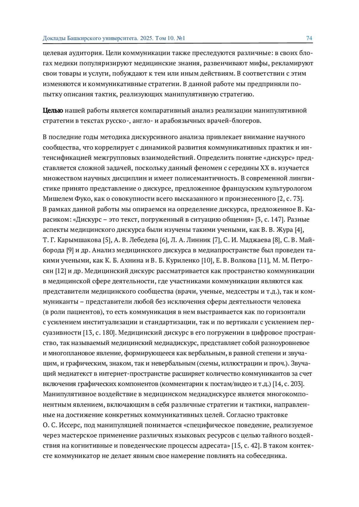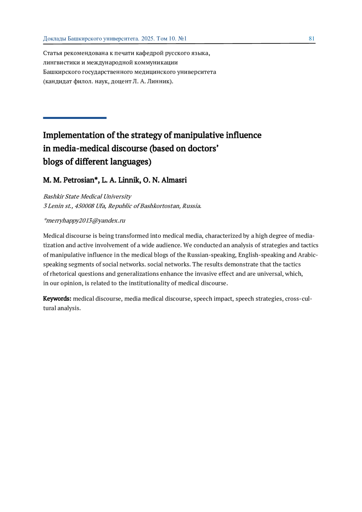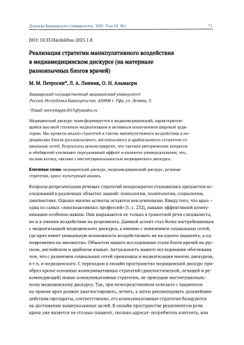 ПЕТРОСЯН М. М., ЛИННИК Л. А., АЛЬМАСРИ О. Н. РЕАЛИЗАЦИЯ СТРАТЕГИИ МАНИПУЛЯТИВНОГО ВОЗДЕЙСТВИЯ В МЕДИАМЕДИЦИНСКОМ ДИСКУРСЕ (НА МАТЕРИАЛЕ РАЗНОЯЗЫЧНЫХ БЛОГОВ ВРАЧЕЙ) // ДОКЛАДЫ БАШКИРСКОГО УНИВЕРСИТЕТА. 2025. Т. 10 № 1