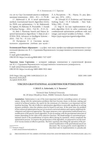 Оптимизация является одним из важнейших инструментов управления системами различной природы. Наряду со ставшими классическими задачами оптимизации при принятии решений и управлении техническими системами, поиск экстремума функции представляет собой важный инструмент в машинном обучении. Особенно существенна роль эффективных алгоритмов оптимизации при решении динамических задач, когда решение должно быть найдено в режиме реального времени. При этом, проблема быстрой численной оптимизации пока что не получила универсального решения и требует дополнительной разработки и усовершенствованных подходов. В работе предложен новый метод оптимизации, основанный на модификации алгоритма гравитационного поиска. Он использует аналогию с гравитационным притяжением масс, зависящих от значения целевой функции. Недостатком обычного гравитационного поиска является проявление при его работе эффектов инерции, которые усложняют процесс оптимизации. Для улучшения работы алгоритма нами предложено использовать модель вязкого движения эффективных частиц. Обсуждаются основные уравнения, описывающие работу представленной модификации гравитационного поиска. Описан алгоритм вязкого гравитационного поиска и приведена его реализация в псевдокоде. Особенности работы алгоритма проанализированы на примерах эталонных целевых функций Растригина и Швефеля со многими локальными минимумами в сравнении с генетическим алгоритмом и стандартным алгоритмом гравитационного поиска с помощью программ, реализованных на языке Python. Нами исследована скорость работы и точность определения минимума функций с различным числом переменных вязким гравитационным алгоритмом. Полученные результаты позволяют сделать вывод о высокой эффективности вязкого гравитационного поиска и целесообразности его применения к решению задач многомерной оптимизации.