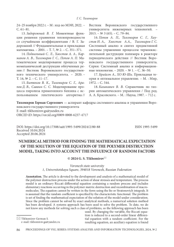Осуществлена структурная и параметрическая идентификация модели процесса деструкции полимеров при термомеханических воздействиях. Решение модели осуществлено с использованием численного метода решения уравнения с обыкновенной и вариационной производными. Численные методы нахождения математического ожидания решения дифференциальных уравнений, которые записываются в форме Ито или Стратоновича, встречаются в литературе [10, 17, 18].