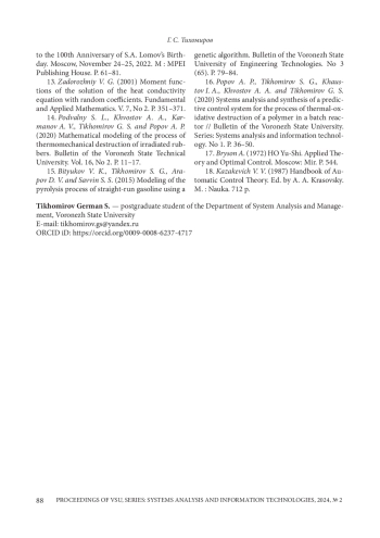 16. Попов А. П., Тихомиров С. Г., Хаустов И. А., Хвостов А.А., Тихомиров Г. С. Системный анализ и синтез предиктивной системы управления процессом термоокислительной деструкции полимера в реакторе периодического действия // Вестник Воронежского государственного университета. Серия: Системный анализ и информационные технологии. - 2020. - № 1. - С. 36-50. EDN: LLVDQL