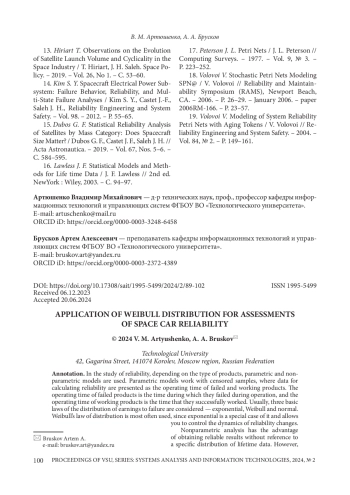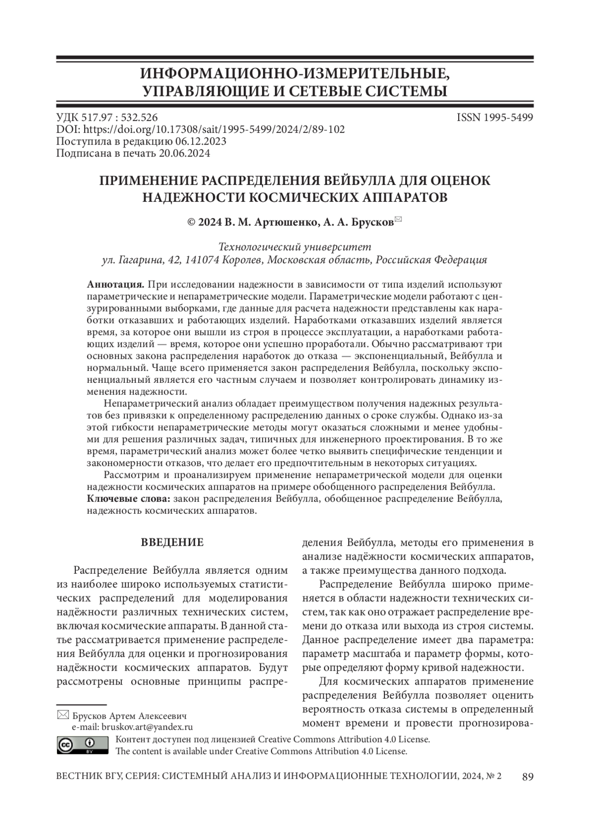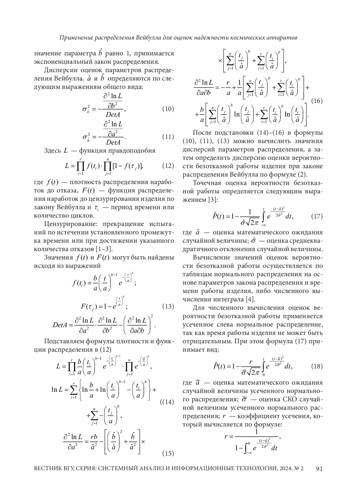 БРУСКОВ А. А., АРТЮШЕНКО В. М. ПРИМЕНЕНИЕ РАСПРЕДЕЛЕНИЯ ВЕЙБУЛЛА ДЛЯ ОЦЕНОК НАДЕЖНОСТИ КОСМИЧЕСКИХ АППАРАТОВ // ВЕСТНИК ВОРОНЕЖСКОГО ГОСУДАРСТВЕННОГО УНИВЕРСИТЕТА. СЕРИЯ: СИСТЕМНЫЙ АНАЛИЗ И ИНФОРМАЦИОННЫЕ ТЕХНОЛОГИИ. 2024. № 2