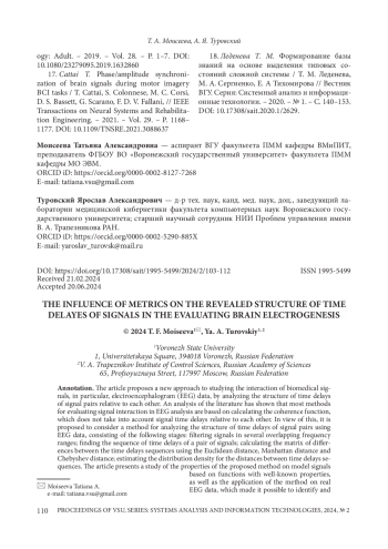 МОИСЕЕВА Т. А., ТУРОВСКИЙ Я. А. ВЛИЯНИЕ МЕТРИКИ НА ВЫЯВЛЕННУЮ СТРУКТУРУ ВРЕМЕННЫХ ЗАДЕРЖЕК СИГНАЛОВ В ЗАДАЧАХ ОЦЕНКИ ЭЛЕКТРОГЕНЕЗА МОЗГА // ВЕСТНИК ВОРОНЕЖСКОГО ГОСУДАРСТВЕННОГО УНИВЕРСИТЕТА. СЕРИЯ: СИСТЕМНЫЙ АНАЛИЗ И ИНФОРМАЦИОННЫЕ ТЕХНОЛОГИИ. 2024. № 2