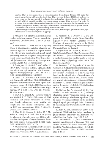 В статье предлагается новый подход к изучению взаимодействия сигналов биомедицинской природы, в частности, данных электроэнцефалограмм (ЭЭГ), путем анализа структуры временных задержек пар сигналов относительно друг друга. Анализ литературы показал, что большинство методов оценки взаимодействия сигналов при анализе ЭЭГ основаны на вычислении функции когерентности, что не учитывает задержки сигналов относительно друг друга по времени. Ввиду этого предлагается рассмотреть метод анализа структуры временных задержек пар сигналов на примере данных ЭЭГ, состоящий из следующих этапов: фильтрации сигналов в нескольких перекрывающихся частотных диапазонах; нахождения последовательности временных задержек пары сигналов; вычисления матрицы расстояний между рядами временных задержек сигналов с использованием расстояния Евклида, манхэттенского расстояния и расстояния Чебышева; оценки плотности распределения для расстояний между последовательностями временных задержек на тестовой выборке. В статье приводится исследование свойств предложенного метода на модельных сигналах, построенных на основе функций с хорошо известными свойствами, а также применение метода на реальных данных ЭЭГ, что позволило выявить и проанализировать задержки реакции людей на фотостимуляцию в зависимости от различных отведений ЭЭГ. Результаты показывают, что разница временных задержек сигналов между различными отведениями ЭЭГ в большинстве случаев у испытуемых отсутствует, но у некоторых испытуемых она составляет около 0,3 сек. (при вычислении с помощью евклидовой метрики), что является существенным запаздыванием на фотостимуляцию между различными участками мозга. При этом метрики, отличные от евклидовой, дают иную оценку расстояний между последовательностями временных задержек, позволяя получить более детализированную, или, напротив, более общую картину. Данный метод может быть полезен при картировании головного мозга на основе данных ЭЭГ.