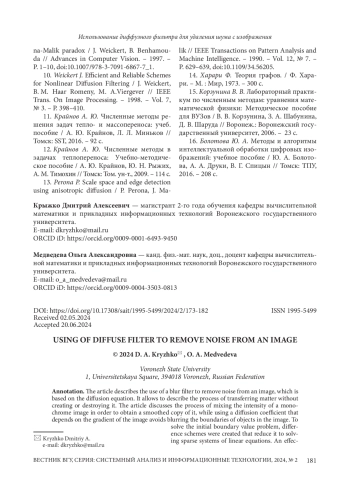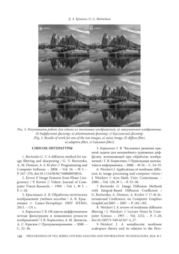 1. Borisenko G. V. A diffusion method for image filtering and sharpening / G. V. Borisenko, A. M. Denisov, A. S. Krylov // Programming and Computer Software. - 2008. - Vol. 34. - № 5. -P. 267-270,. DOI: 10.1134/S0361768808050034 EDN: LLLAZB
