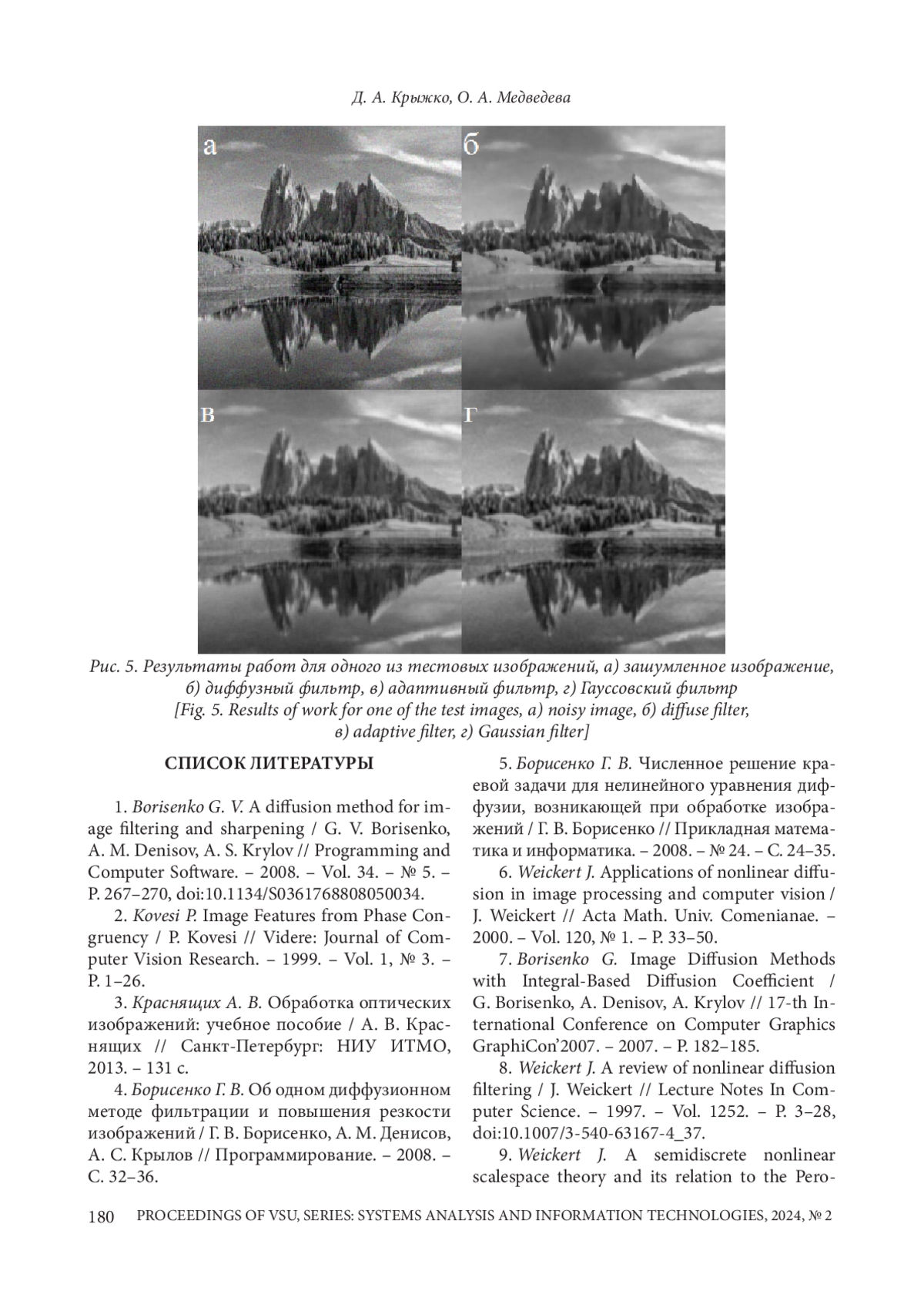 4. Борисенко Г. В. Об одном диффузионном методе фильтрации и повышения резкости изображений / Г. В. Борисенко, А. М. Денисов, А. С. Крылов // Программирование. - 2008. -С. 32-36. EDN: LMBVBD