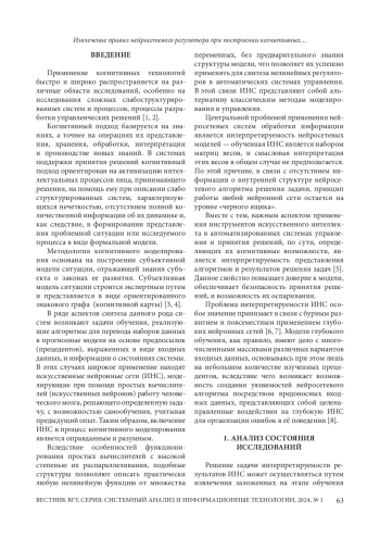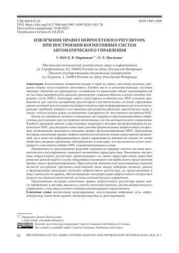Когнитивные технологии входят в один из самых «интеллектуальных» разделов теории искусственного интеллекта. Особое место в интеллектуальных системах занимает обучение по прецедентам, основанное на выявлении общих закономерностей по частным эмпирическим данным, реализуемое главным образом в искусственных нейронных сетях (ИНС). Благодаря своим структурным особенностям, ИНС успешно применяются для синтеза нелинейных регуляторов в автоматических системах управления, однако неявный для пользователя нейросетевой алгоритм формирования результатов порождает проблему доверия к его выводам при решении реальных практических задач, в связи с чем актуальна задача установления «прозрачности» внутреннего алгоритма ИНС. Целью исследования является повышение достоверности функционирования нейро-сетевых регуляторов при построении когнитивных систем автоматического управления. В работе выполнен анализ существующих подходов и методов интерпретируемости результатов ИНС, рассмотрены известные способы формализации нейросетевых алгоритмов, позволяющие выполнить описание правил функционирования ИНС. Предложена методика извлечения правил нейросетевого регулятора на основе гранулярных вычислений, где в качестве информационных гранул принимаются множества схожих по своим свойствам входных признаков, объединенных в кластеры, что достигается путем интеграции в слои многослойных ИНС самоорганизующихся слоев. Применимость предложенных решений показана на примере синтеза системы автоматического регулирования, имеющей нелинейные характеристики. Выполнено построение нейросетевого регулятора, превосходящего по своим характеристикам известные решения данной задачи, а также обладающего возможностью вербального представления правил своего функционирования. Практической значимостью предложенных решений является построение причинно-следственной связи между наборами входных данных и формируемым выходным сигналом нейросетевого регулятора, их представлением в виде совокупности правил, обеспечивающих интерпретацию нейросетевого алгоритма в аспекте построения когнитивной системы автоматического управления. Предложенная методика извлечения правил нейросетевого регулятора может найти применение в методах анализа и синтеза интеллектуальных систем автоматического управления, о чем даны соответствующие рекомендации и предложения.
