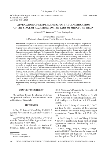 Диагностика болезни Альцгеймера на ранней стадии развития играет существенную роль при лечении данного заболевания, поскольку определение тяжести заболевания и риска его прогрессирования позволяет провести профилактические меры своевременно, до того, как сформируются необратимые поражения головного мозга. Болезнь Альцгеймера представляет собой хроническое дегенеративное заболевание, связанное с повреждением нейронов головного мозга. Для диагностики данного заболевания наряду с другими методами используется МРТ головного мозга. Интерес представляют формализованные автоматизированные инструменты анализа МРТ, которые могут служить средством поддержки принятия решений при постановке диагноза. Эффективным механизмом разработки подобных инструментов при наличии большой обучающей выборки могут служить методы глубокого обучения, в частности методы, базирующиеся на построении сверточных нейронных сетей. Обзор исследований в данной области отражает целый ряд успешных вычислительных экспериментов по применению сверточных нейронных сетей к анализу медицинских изображений. В данной работе осуществляется попытка использовать сверточную нейронная сеть (CNN) для классификации стадии болезни Альцгеймера на основе МРТ головного мозга. Выделяются следующие основные классы (уровни заболевания): NonDementia (отсутствие деменции), VeryMildDementia (ранняя деменция), MildDementia (умеренная деменция), ModerateDementia (тяжелая деменция). Предложенная в работе модель демонстрирует хорошее качество с позиции основных метрик классификации, позволяет с большой точностью определять все стадии заболевания, причем, лучше всего определяется класс VeryMildDemented. Распознавание именно данной стадии заболевания очень важно с точки зрения подбора предупреждающего развитие болезни лечения.