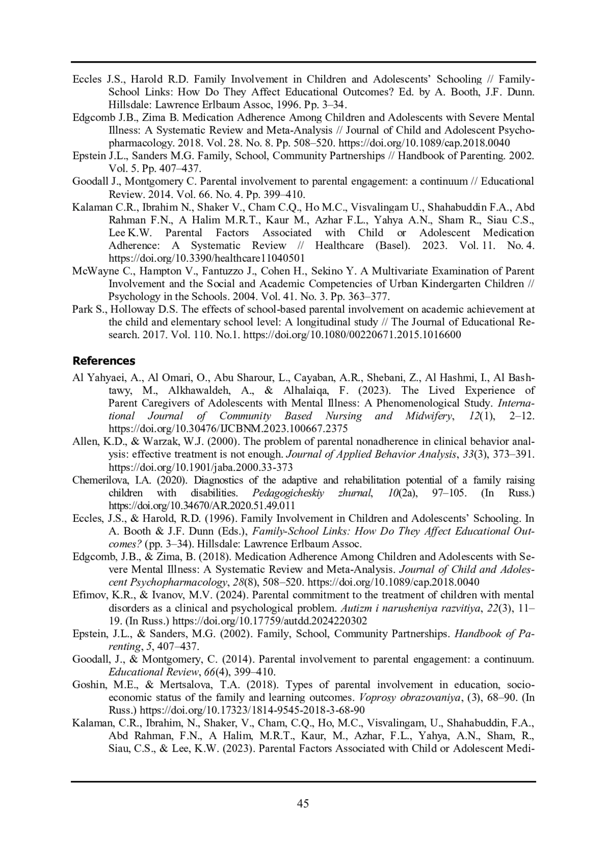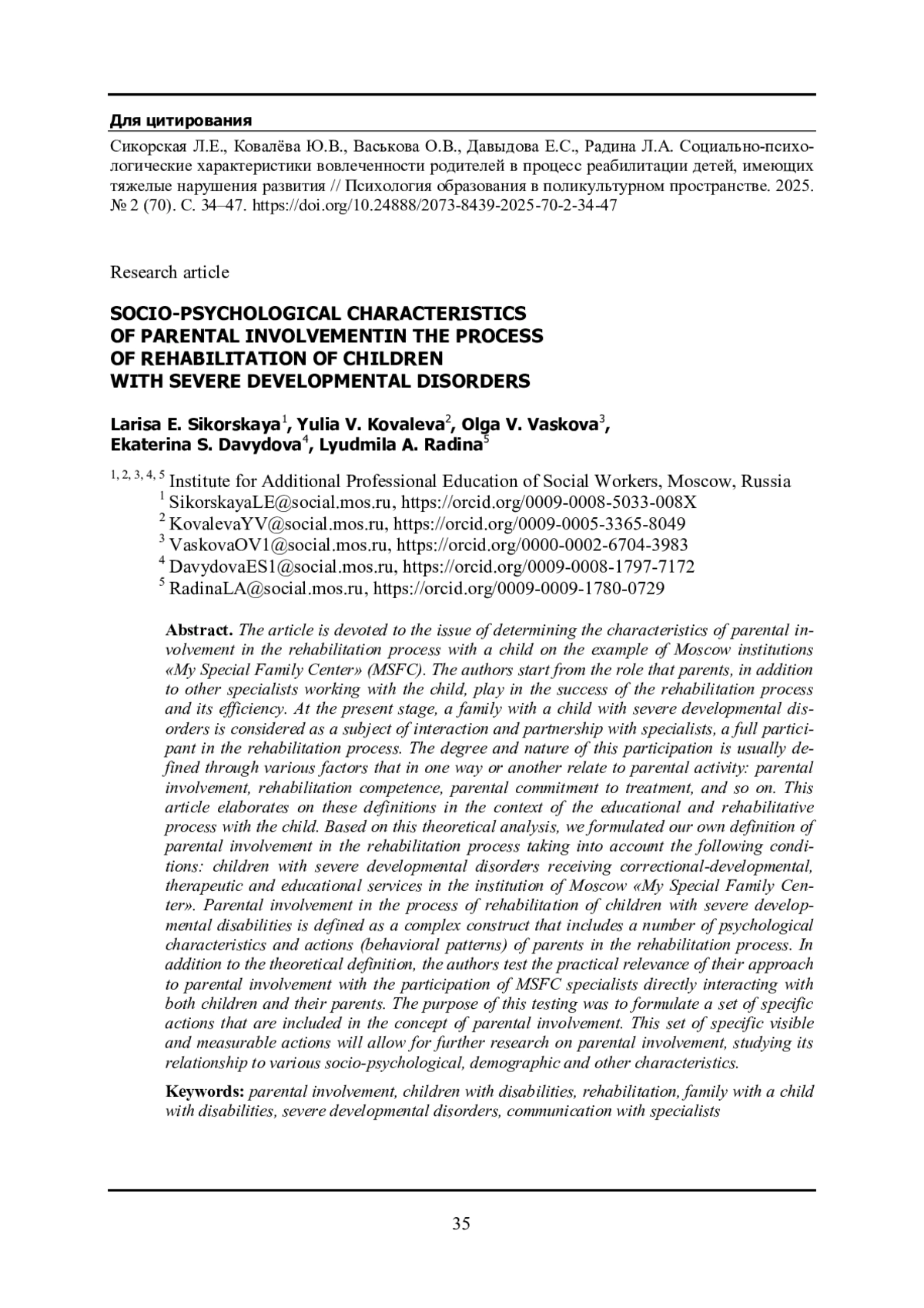 СИКОРСКАЯ Л. Е., КОВАЛЀВА Ю. В., ВАСЬКОВА О. В., ДАВЫДОВА Е. С., РАДИНА Л. А. СОЦИАЛЬНО-ПСИХОЛОГИЧЕСКИЕ ХАРАКТЕРИСТИКИ ВОВЛЕЧЕННОСТИ РОДИТЕЛЕЙ В ПРОЦЕСС РЕАБИЛИТАЦИИ ДЕТЕЙ, ИМЕЮЩИХ ТЯЖЕЛЫЕ НАРУШЕНИЯ РАЗВИТИЯ // ПСИХОЛОГИЯ ОБРАЗОВАНИЯ В ПОЛИКУЛЬТУРНОМ ПРОСТРАНСТВЕ. 2025. № 2 (70)