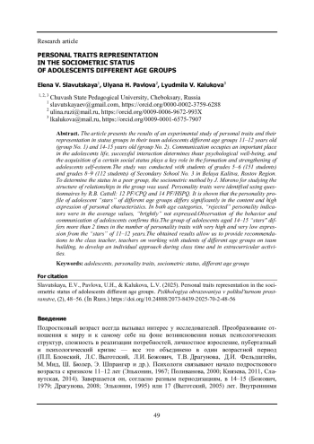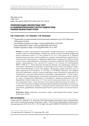 СЛАВУТСКАЯ Е. В., ПАВЛОВА У. Х., КАЛУКОВА Л. В. РЕПРЕЗЕНТАЦИЯ ЛИЧНОСТНЫХ ЧЕРТ В СОЦИОМЕТРИЧЕСКОМ СТАТУСЕ ПОДРОСТКОВ РАЗНЫХ ВОЗРАСТНЫХ ГРУПП // ПСИХОЛОГИЯ ОБРАЗОВАНИЯ В ПОЛИКУЛЬТУРНОМ ПРОСТРАНСТВЕ. 2025. № 2 (70)